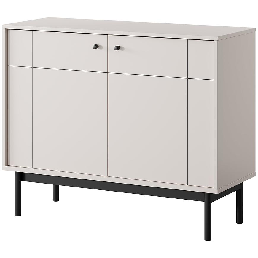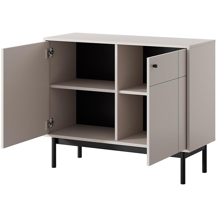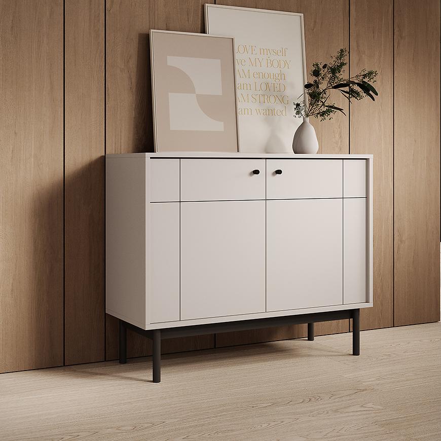Fronty w kolorze kaszmir w matowym wykończeniu nadają meblowi naturalny, elegancki charakter, który doskonale wpisuje się w nowoczesne wnętrza. Komoda została wykonana z trwałej laminowanej płyty wiórowej, co gwarantuje jej długowieczność i odporność na codzienne użytkowanie.