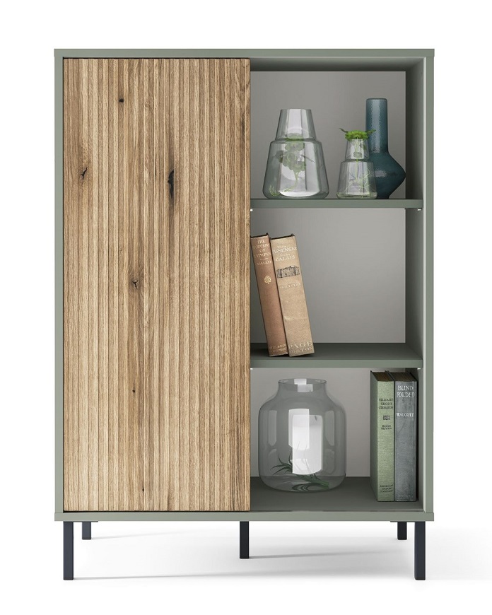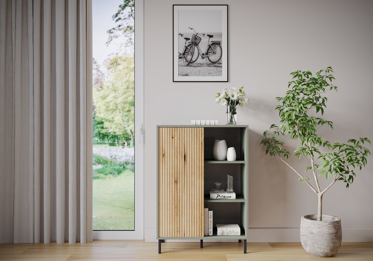 Komoda jednodrzwiowa Pozzi 1D to propozycja, która odnajdzie się w wielu aranżacjach. Jej zielony kolor inspirowany naturą pięknie współgra z ciepłymi odcieniami drewna, beżami i czernią, co sprawia, że z łatwością wkomponujesz ją w wystrój: