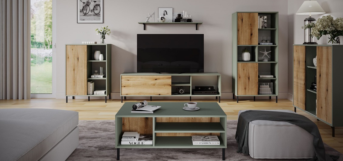 Komoda jednodrzwiowa Pozzi 1D to połączenie nowoczesnego designu, modnych kolorów i przemyślanej funkcjonalności. Mebel doskonale wpisuje się w aktualne trendy wnętrzarskie, gdzie zrównoważony minimalizm spotyka się z naturalnymi inspiracjami. Utrzymana w eleganckiej tonacji szarozielonej barwy i uzupełniona o ryflowany front w odcieniu Dąb Coast Evoke, komoda stanowi efektowny element wyposażenia każdego wnętrza – od salonu, przez jadalnię, po pokój młodzieżowy.