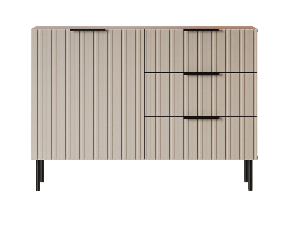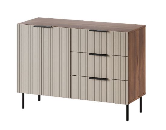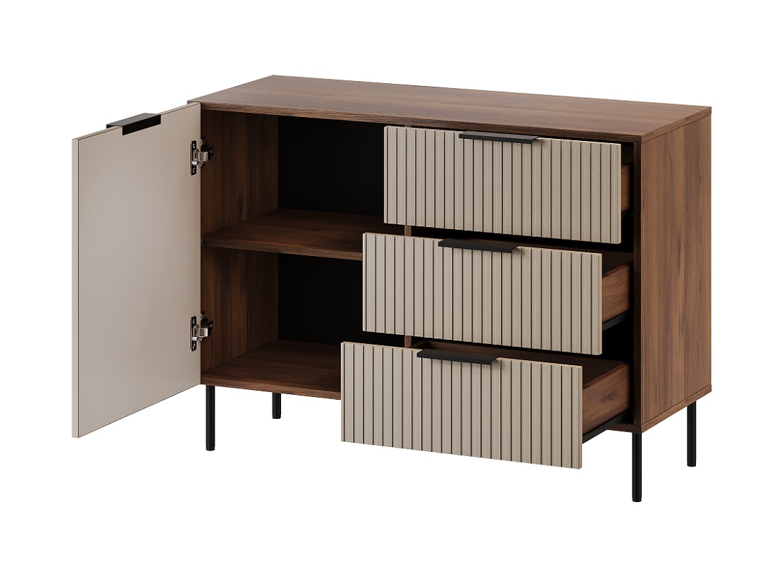 Korpus komody został wykonany w eleganckim wybarwieniu orzech warmia, który nadaje wnętrzu ciepły, naturalny charakter. Fronty frezowane w odcieniu kaszmir z elementami lamelki dodają komodzie wyjątkowego stylu. Te subtelne, nowoczesne detale doskonale wpisują się w najnowsze trendy wnętrzarskie, czyniąc komodę Almera nie tylko funkcjonalnym, ale i designerskim dodatkiem do każdego pomieszczenia.