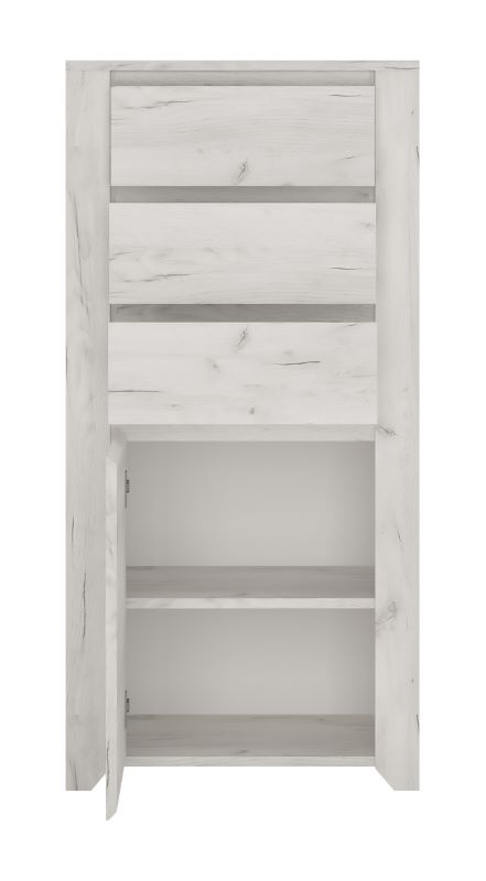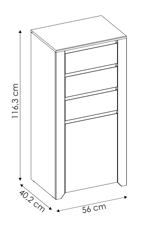 Mebel ma wymiary: szerokość 56 cm, wysokość 116,3 cm i głębokość 40,2 cm, co czyni go doskonałym wyborem do sypialni, salonu, biura czy pokoju młodzieżowego. Komoda wyposażona jest w trzy praktyczne szuflady oraz jedną zamykaną szafkę, które umożliwiają wygodne przechowywanie ubrań, dokumentów, akcesoriów lub innych drobiazgów.
