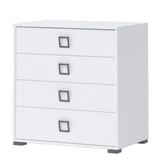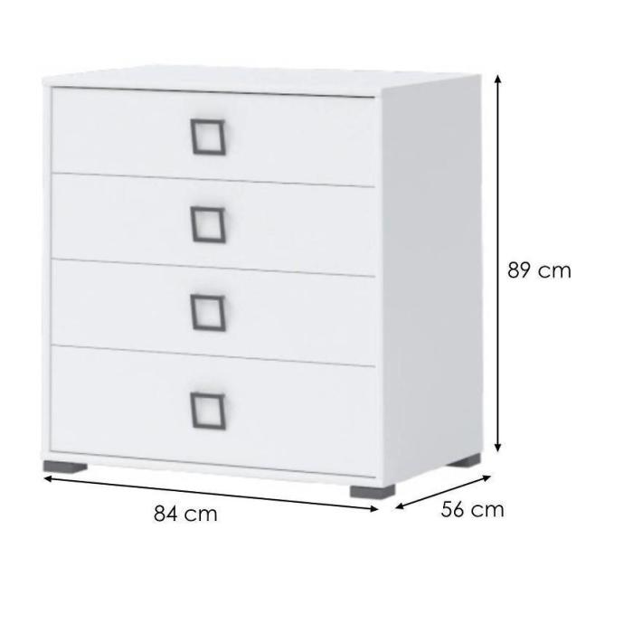 Komoda KIKI to doskonała propozycja pokoju młodzieżowego, a takze salonu, przedpokoju czy pokoju dziennego. Doskonale sprawdzi się jako funkcjonalna komoda do przechowywania. Posiada cztery szuflady dzięki czemu ma łatwy dostęp do wnętrza oraz wystarczającą przestrzeń do przechowywania. Materiał korpusu i frontów z którego została wykonana komoda to płyta wiórowa laminowana. Charakteryzuje się interesującym wykończeniem uchwytów, który ożywi wnętrza.