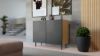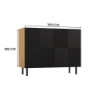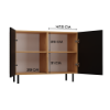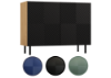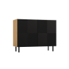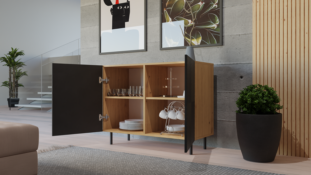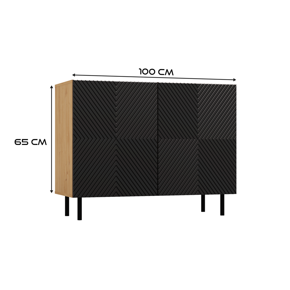 Doskonałym wyborem do pokoju dziennego będzie komoda w kolorze czarny/dąb artisan posiada ryflowane fronty drzwi imitujące lamele. Materiał wykonania to korpus płyta wiórowa laminowana 16 mm, front - płyta MDF o grubości 18 mm, melaminowana, frezowana, oklejona folią. Komoda posiada dwie szafki z systemem TIP-ON. Dodatkowo komoda ma okrągłe metalowe nogi o wysokości 13 cm. Komoda dopełni również wystrój salonu, czy przedpokoju, stanowiąc wygodne miejsce do przechowywania mniejszych i większych rzeczy. Mebel do samodzielnego montażu.