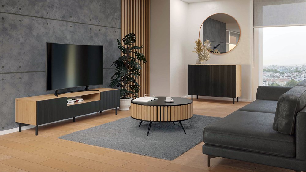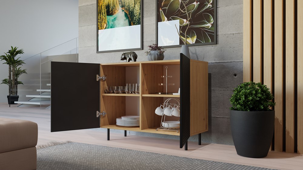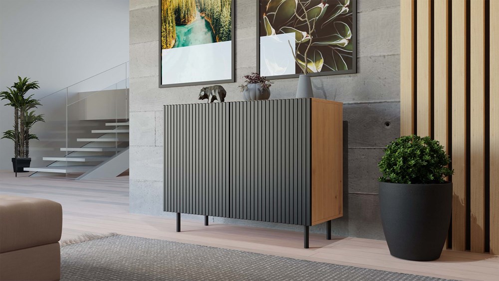 Doskonałym wyborem do pokoju dziennego będzie komoda w kolorze czarny/dąb artisan posiada ryflowane pionowe fronty drzwi imitujące lamele. Materiał wykonania to korpus płyta wiórowa laminowana 16 mm, front - płyta MDF o grubości 18 mm, melaminowana, frezowana, oklejona folią. Komoda posiada dwie szafki z systemem TIP-ON. Dodatkowo komoda ma okrągłe metalowe nogi o wysokości 13 cm. Komoda dopełni również wystrój salonu, czy przedpokoju, stanowiąc wygodne miejsce do przechowywania mniejszych i większych rzeczy. Mebel do samodzielnego montażu.