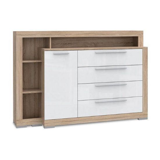 Doskonałym wyborem do pokoju dziennego będzie komoda w kolorze dąb sonoma/biały połysk z serii Julietta, materiał wykonania płyta wiórowa. Komoda posiada drzwiczki oraz szuflady z uchwytami w kolorze aluminium, dzięki czemu ma łatwy dostęp do wnętrza. Dodatkowym atutem są półki,na których można położyć książki, kwiaty. Komoda stanowiąc wygodne miejsce do przechowywania mniejszych i większych rzeczy. Meble do samodzielnego montażu.