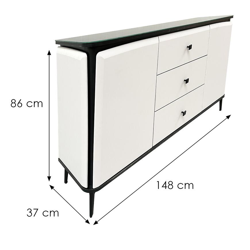 Komoda ma szerokość 148 centymetrów, wysokość 86 centymetrów i głębokość 37 centymetrów. Dwudrzwiowa konstrukcja w połączeniu z trzema szufladami pozwala maksymalnie wykorzystać przestrzeń użytkową, zapewniając wygodne przechowywanie przedmiotów codziennego użytku.