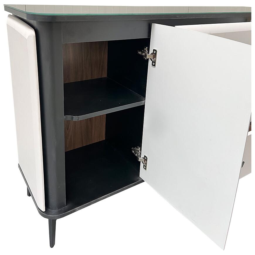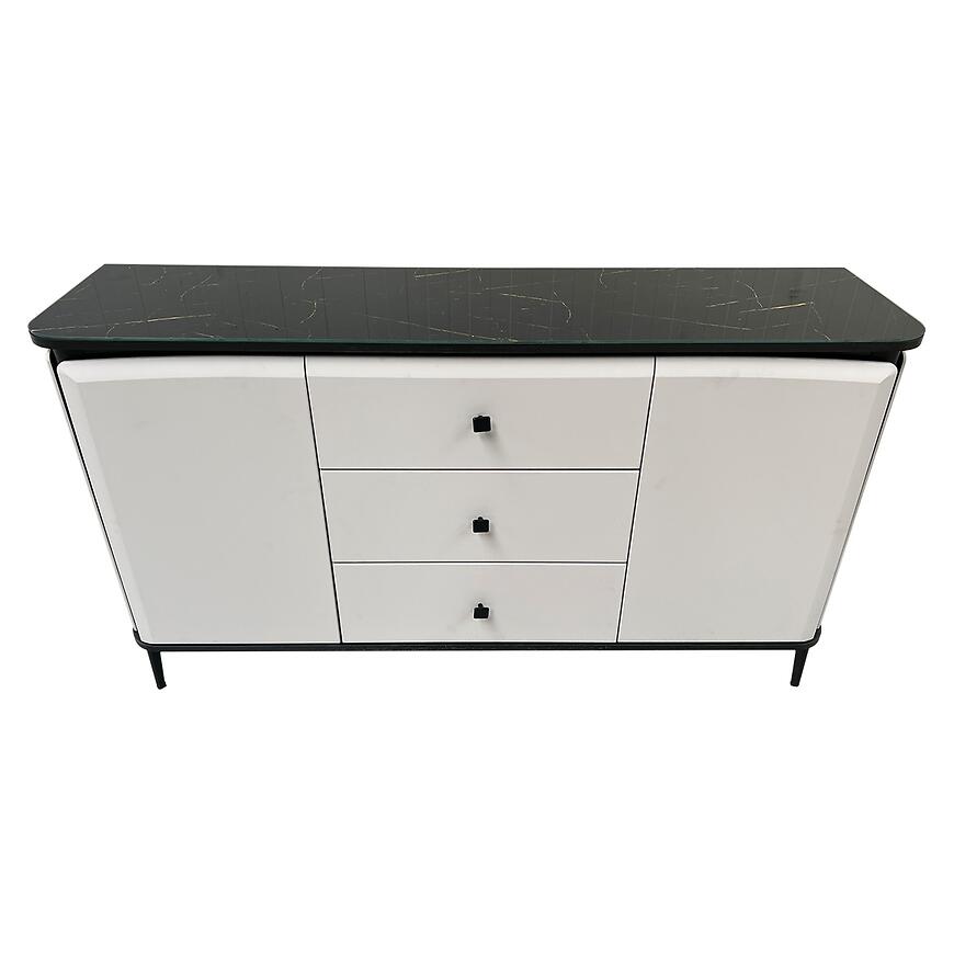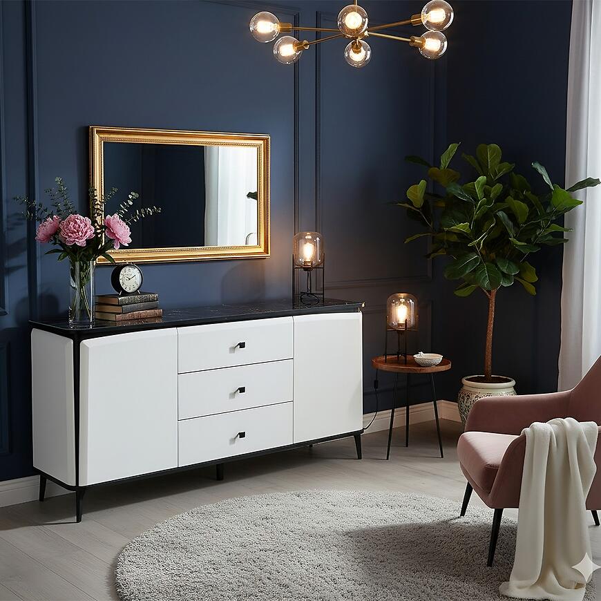 Fronty w odcieniu kaszmiru w połączeniu z kontrastującym, częściowo czarnym korpusem tworzą eleganckie zestawienie kolorystyczne. Marmurowy blat stanowi subtelny akcent luksusu, podkreślając estetykę całego mebla. Komoda K2 148 wyróżnia się prostą, geometryczną formą i harmonijnymi proporcjami, które nadają jej współczesnego charakteru i sprawiają, że doskonale wpisuje się w nowoczesne aranżacje.