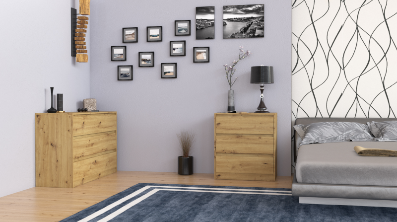 Komoda Elia to mebel idealny do pokoju dziennego, salonu lub sypialni. Kolor mebla dąb artisan wpasuje się w wiele aranżacji w nowoczesnych wnętrzach jak również we wnętrzach klasycznych. Szafka posiada szuflady do przechowywania odzieży lub innych przedmiotów. Szuflady bezuchwytowe wyposażone zostały w prowadnice rolkowe. Płyta laminowana o grubości 16mm to płyta, z której wykonano komodę. Do kompletu można dokupić inne meble z kolekcji.
