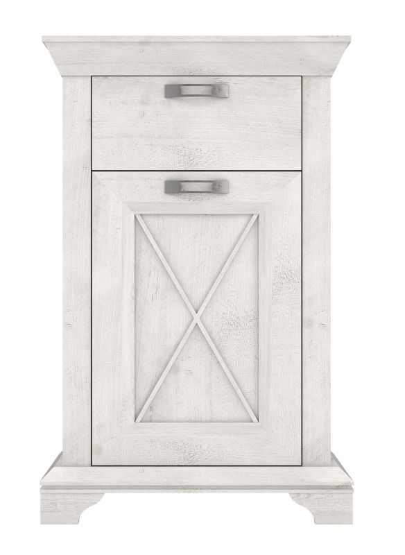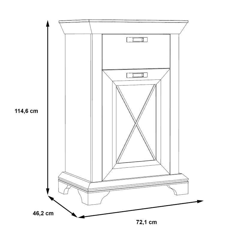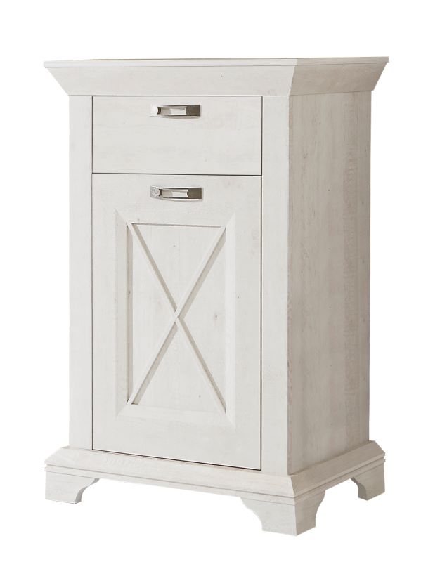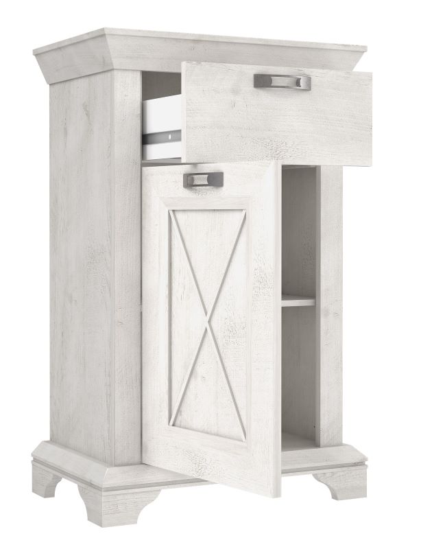 Komoda z kolekcji Kashmir dedykowana do przedpokoju w klasycznym stylu. Bogate zdobienia nadają jej niecodzienny charakter. Komoda wykanana w dekorze pinia biała. Metalowe uchwyty w kolorze imitującym stare srebro. Komoda posiada jedną szufladę oraz pojedyńcze drzwi uchylne.