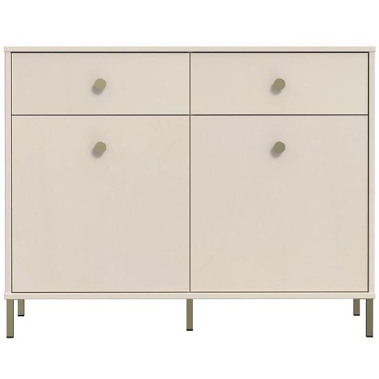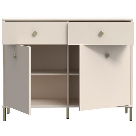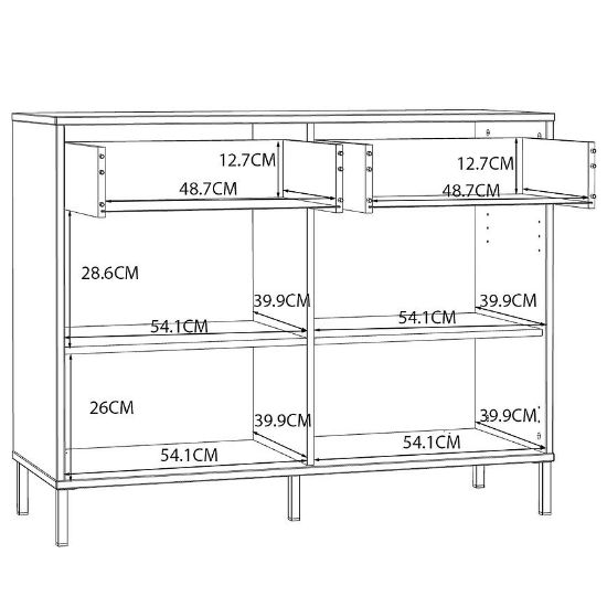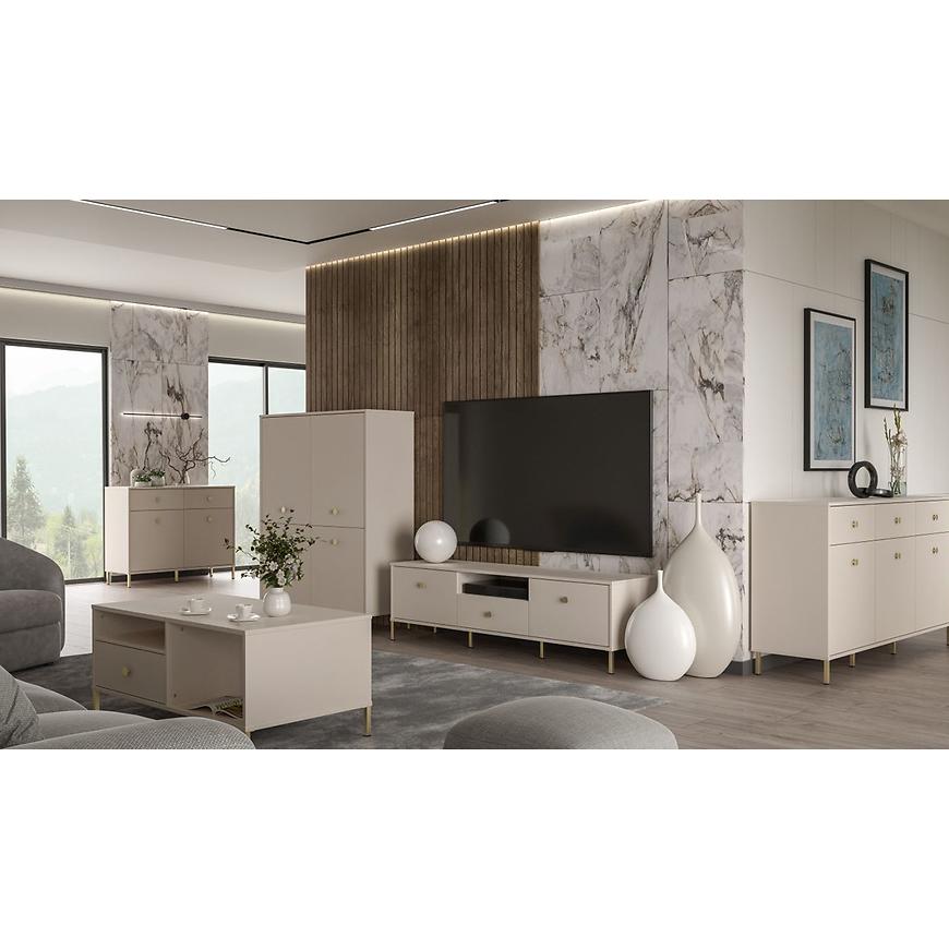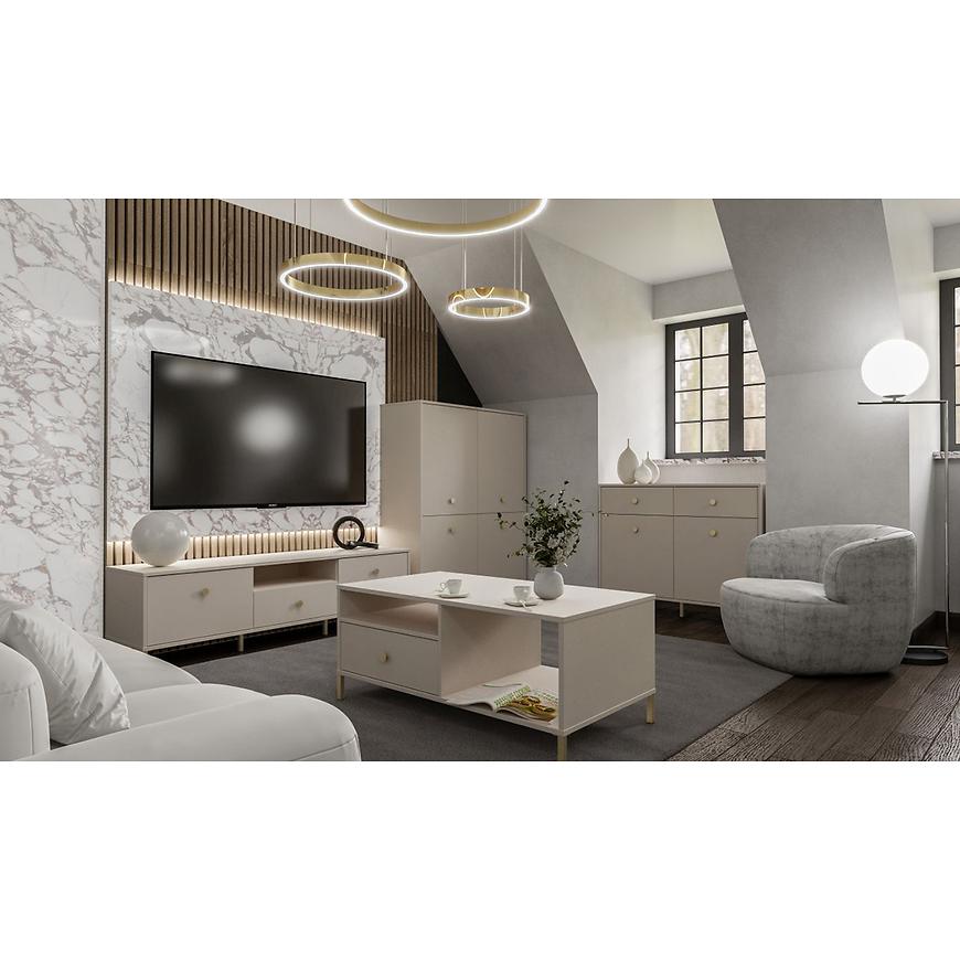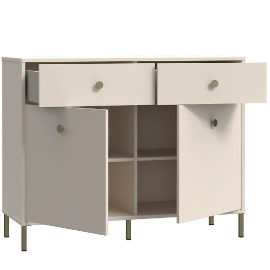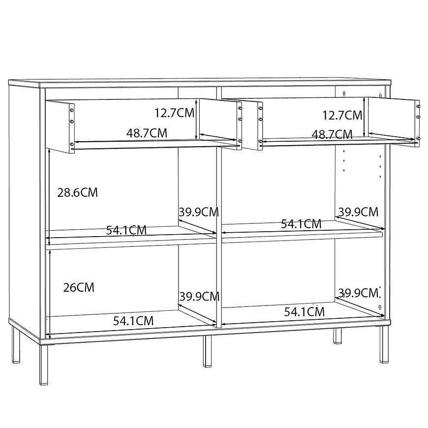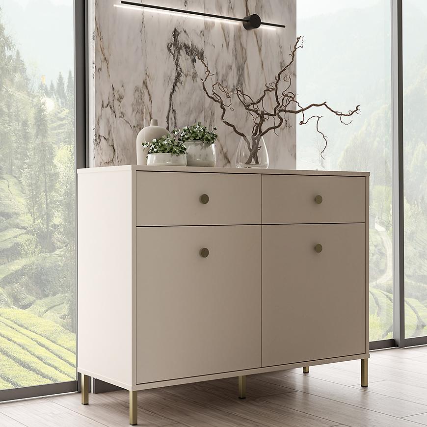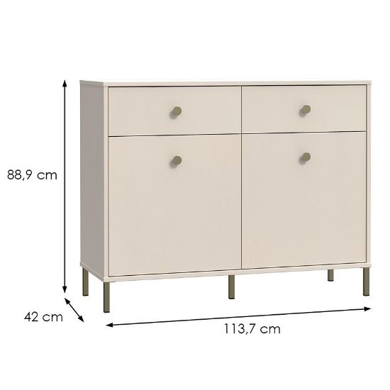 Dwudrzwiowa konstrukcja oraz dwie pojemne szuflady oferują mnóstwo miejsca na przechowywanie, sprawiając, że komoda jest zarówno praktyczna, jak i stylowa. Matowe wykończenie frontów i korpusu dodaje jej nowoczesnego charakteru, a zastosowanie laminowanej płyty wiórowej gwarantuje trwałość i łatwość w utrzymaniu.