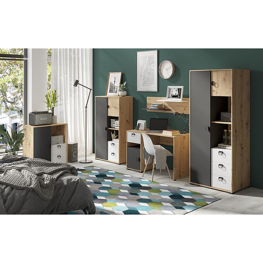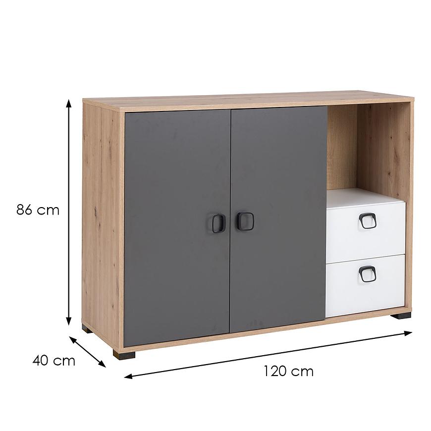Doskonałym wyborem do pokoju młodzieżowego będzie komoda w kolorze grafit/ biały z serii Kevin, materiał wykonania to płyta wiórowa laminowana. Komoda posiada drzwiczki oraz szuflady, dzięki czemu ma łatwy dostęp do wnętrza. Komoda dopełni również wystrój pokoju lub innego pomieszczenia, stanowiąc wygodne miejsce do przechowywania mniejszych i większych rzeczy. Mebel do samodzielnego montażu.