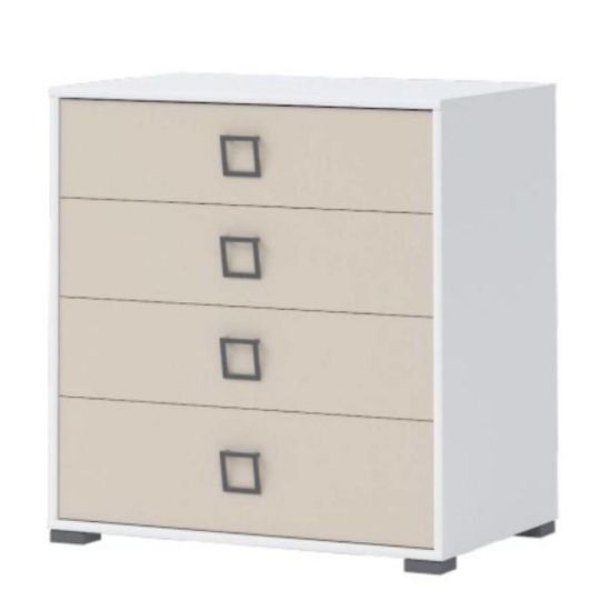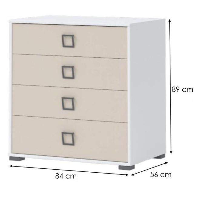 Komoda KIKI to doskonała propozycja pokoju młodzieżowego, a takze salonu, przedpokoju czy pokoju dziennego. Doskonale sprawdzi się jako funkcjonalna komoda do przechowywania. Posiada cztery szuflady, dzięki czemu ma łatwy dostęp do wnętrza oraz wystarczającą przestrzeń do przechowywania. Materiał korpusu i frontów z którego została wykonana komoda to płyta wiórowa laminowana. Charakteryzuje się interesującym wykończeniem uchwytów, który ożywi wnętrza.