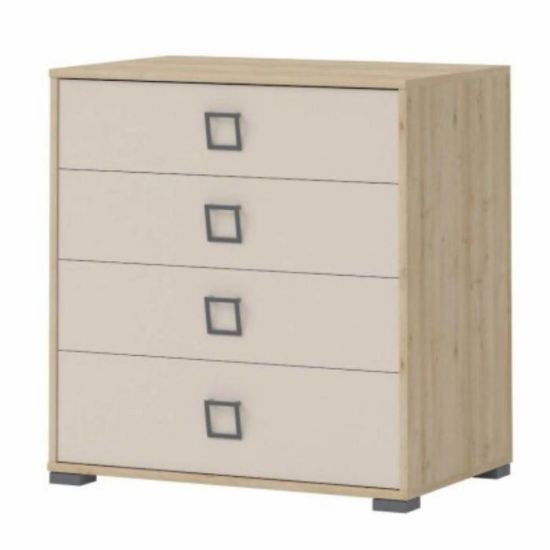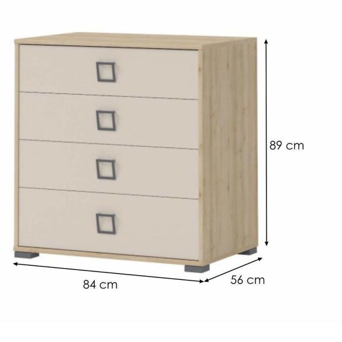 Komoda KIKI to doskonała propozycja do pokoju młodzieżowego, a także salonu, przedpokoju czy pokoju dziennego. Doskonale sprawdzi się jako funkcjonalna komoda do przechowywania. Posiada cztery szuflady, dzięki czemu ma łatwy dostęp do wnętrza oraz wystarczającą przestrzeń do przechowywania. Materiał korpusu i frontów z którego została wykonana komoda to płyta wiórowa laminowana. Charakteryzuje się interesującym wykończeniem uchwytów, który ożywi wnętrza.