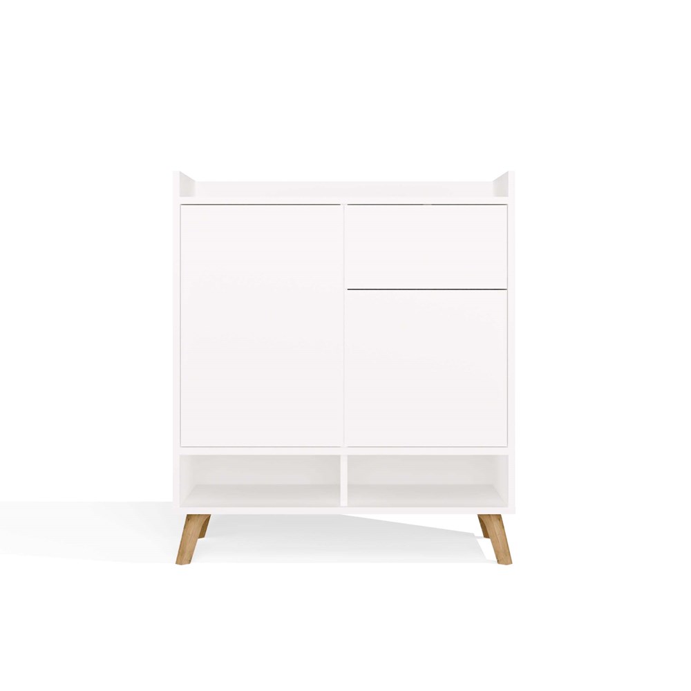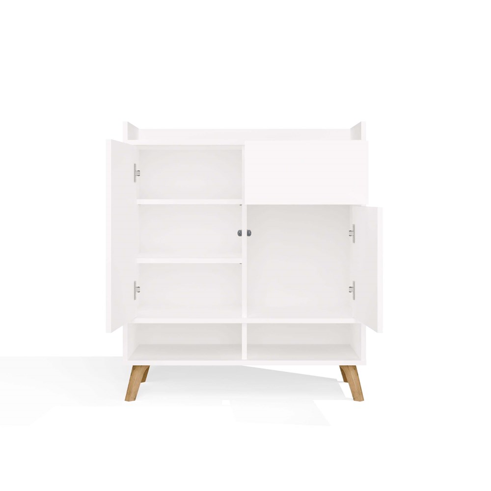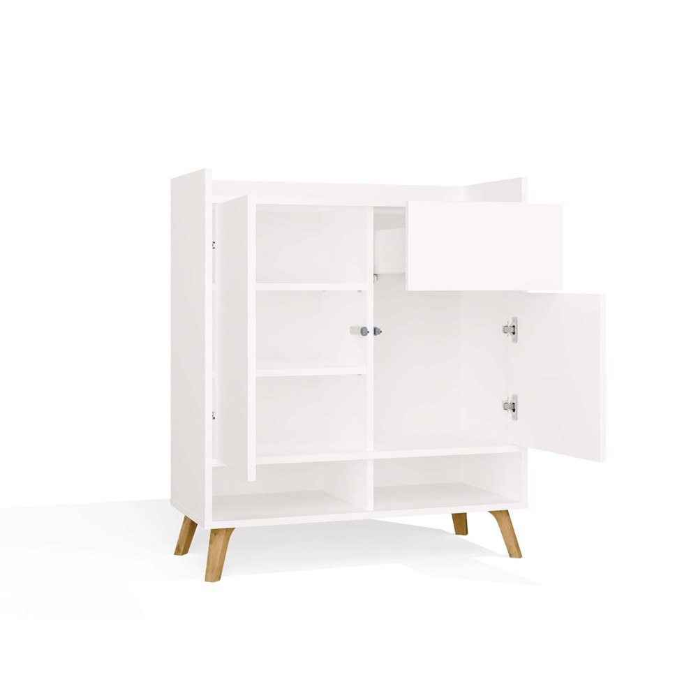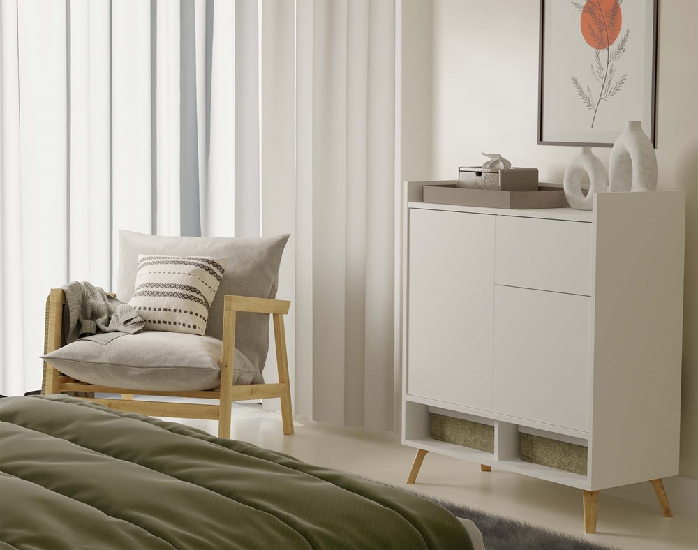 Nowoczesna i funkcjonalna komoda Kolin w kolorze białym to idealny wybór do każdego wnętrza – od salonu, przez sypialnię, aż po pokój dziecięcy. Jej minimalistyczny design, fronty bez uchwytów oraz wysokie drewniane nóżki w kolorze Dąb Artisan (wys. ok. 12 cm) nadają jej wyjątkowej lekkości i stylu inspirowanego skandynawskim wzornictwem.