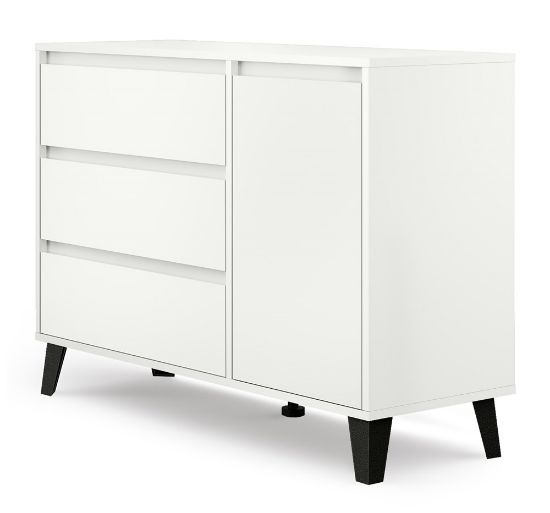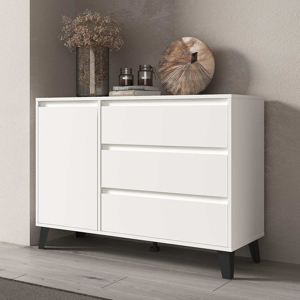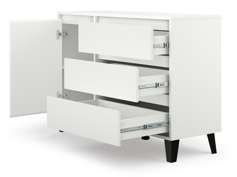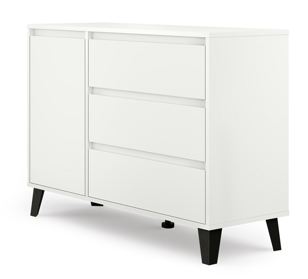 Komoda Koni to nie tylko praktyczne rozwiązanie do przechowywania, ale także element, który dodaje stylu i elegancji każdemu pomieszczeniu. Jej trzy szuflady na prowadnicach kulkowych oraz szafka z półką zapewniają doskonałe miejsce na przechowywanie różnorodnych przedmiotów, począwszy od ubrań po drobne akcesoria.