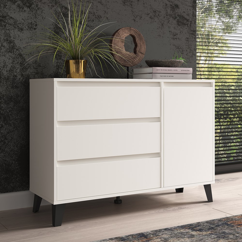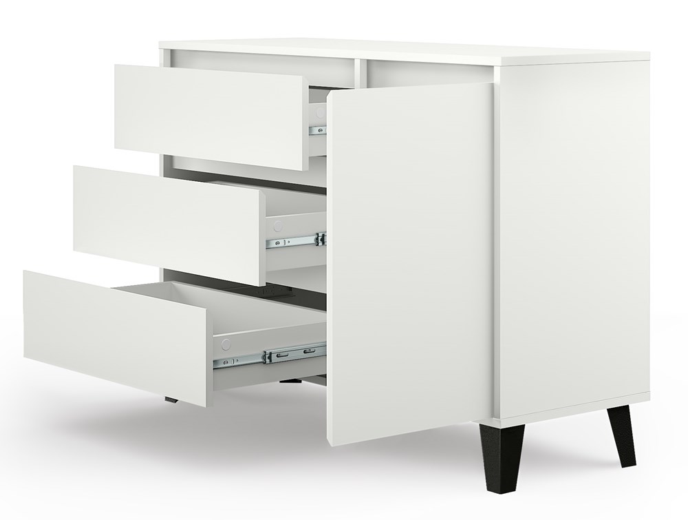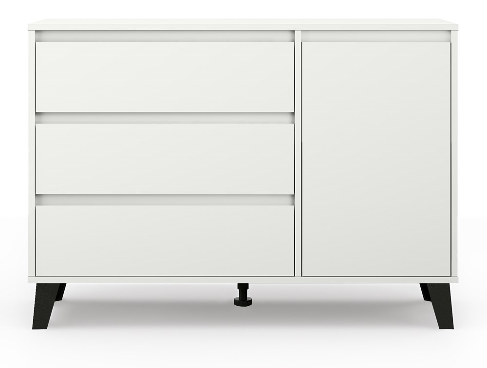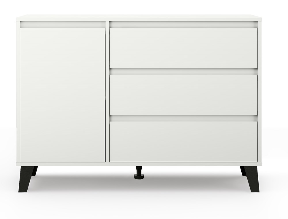 Czarne, eleganckie nóżki komody Koni o wysokości 12 cm stanowią nie tylko stabilne wsparcie, ale także nadają meblowi wyjątkowego charakteru. Ich kontrast z jasnym kolorem laminowanej płyty wiórowej, z której wykonana jest komoda, tworzy harmonijną i nowoczesną estetykę. Materiał ten nie tylko nadaje meblowi trwałość, ale również sprawia, że jest łatwy w utrzymaniu czystości.