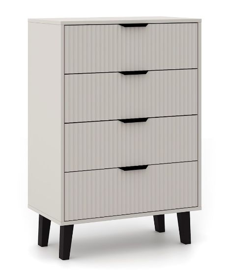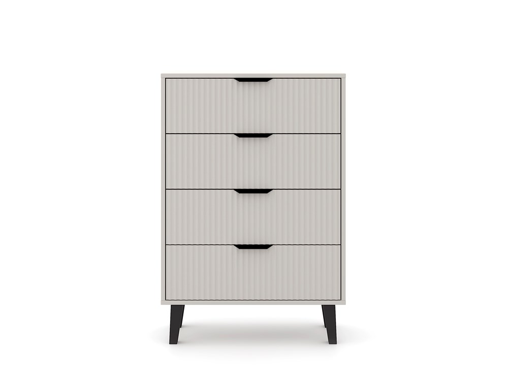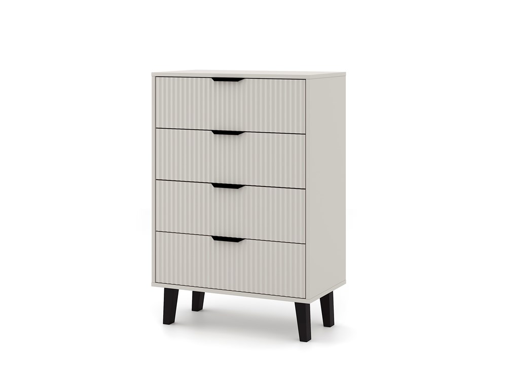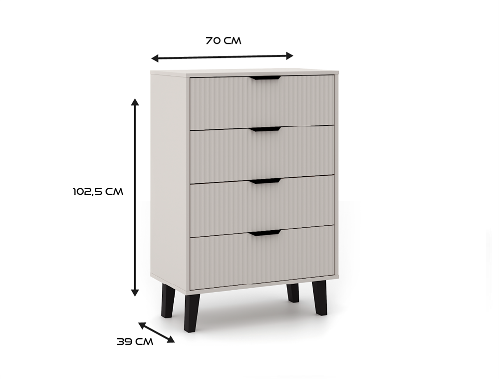 Komoda Koni oferuje cztery pojemne szuflady co czyni ją idealnym wyborem do przechowywania ubrań, dokumentów, tekstyliów i różnego rodzaju akcesoriów. To mebel, który łączy wysoką estetykę z codzienną funkcjonalnością.