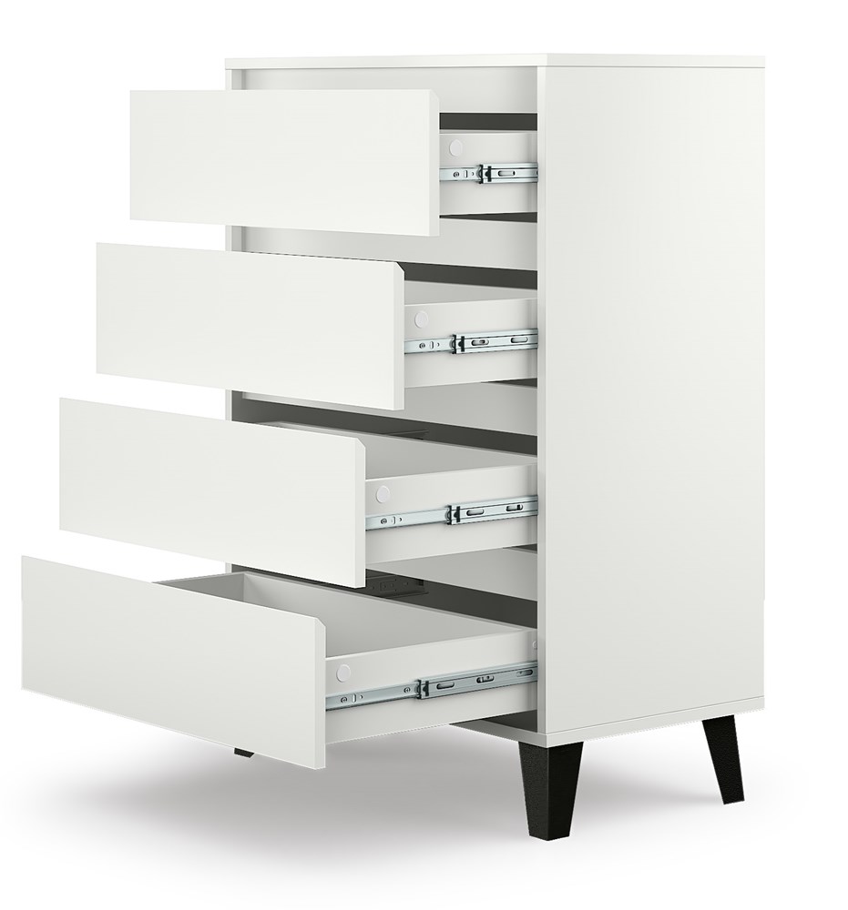 Komoda Koni to nie tylko praktyczne rozwiązanie do przechowywania, ale także element, który dodaje stylu i elegancji każdemu pomieszczeniu. Jej cztery pojemne szuflady na prowadnicach kulkowych zapewniają doskonałe miejsce na przechowywanie różnorodnych przedmiotów, począwszy od ubrań po drobne akcesoria.