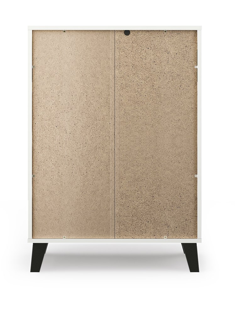 Czarne, eleganckie nóżki komody Koni o wysokości 12 cm stanowią nie tylko stabilne wsparcie, ale także nadają meblowi wyjątkowego charakteru. Ich kontrast z jasnym kolorem laminowanej płyty wiórowej, z której wykonana jest komoda, tworzy harmonijną i nowoczesną estetykę. Materiał ten nie tylko nadaje meblowi trwałość, ale również sprawia, że jest łatwy w utrzymaniu czystości.