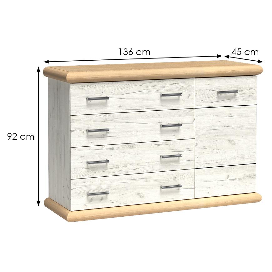 Doskonałym wyborem do pokoju dziennego będzie komoda w kolorze kraft złoty/kraft biały z serii Kora, materiał wykonania to płyta meblowa. Komoda posiada drzwiczki oraz szuflady, dzięki czemu ma łatwy dostęp do wnętrza. Komoda dopełni również wystrój salonu, czy przedpokoju, stanowiąc wygodne miejsce do przechowywania mniejszych i większych rzeczy. Mebel do samodzielnego montażu. Dostępna kolorystyka pozwala na dopasowanie mebla do aranżowanej przestrzeni i stworzenie odpowiedniej atmosfery - domowego ciepła lub biurowej elegancji. Mebel do samodzielnego montażu.