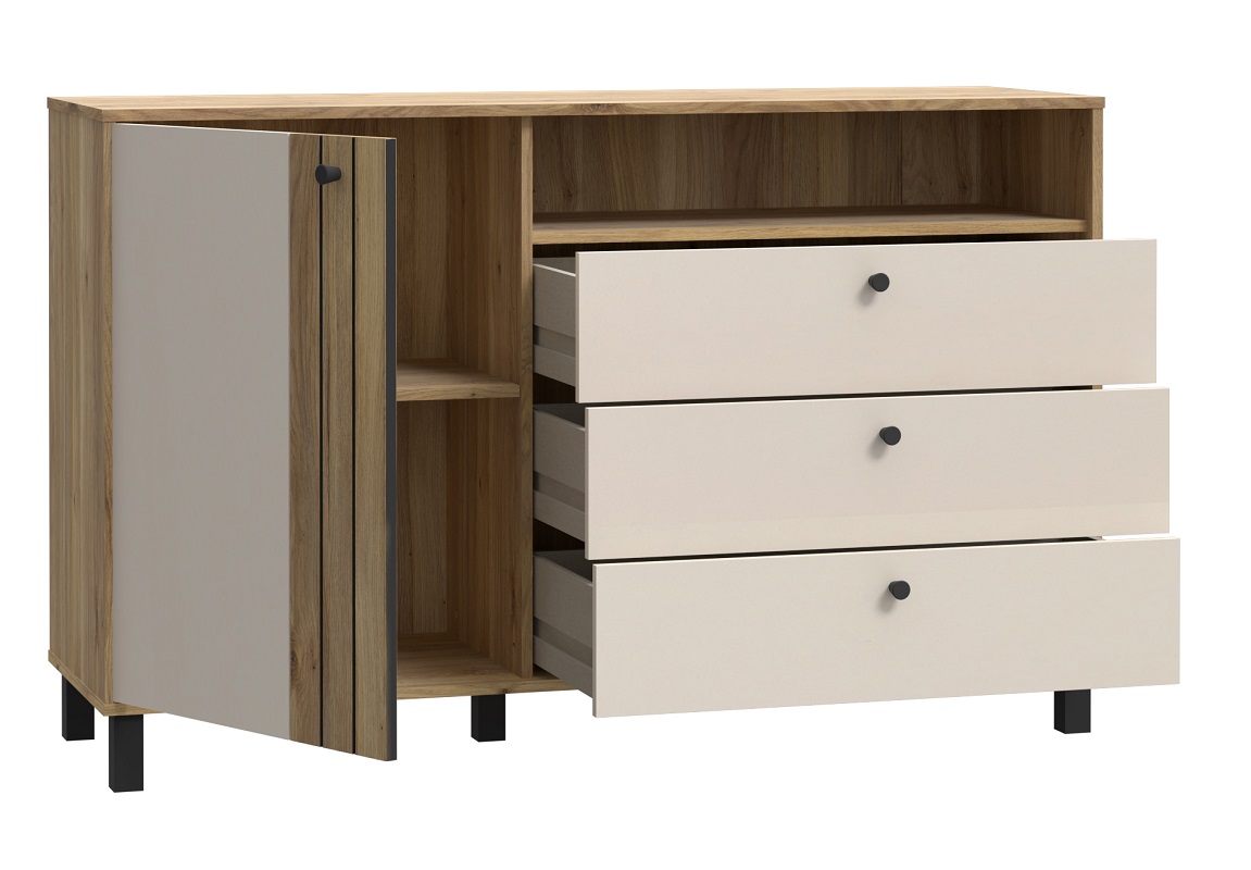 Piaskowy front z elementami w kolorze dębu mauvella tworzy subtelny kontrast, dodając komodzie nowoczesnego wyrazu. To perfekcyjne połączenie kolorów, które sprawi, że komoda stanie się stylowym akcentem w każdym pomieszczeniu.