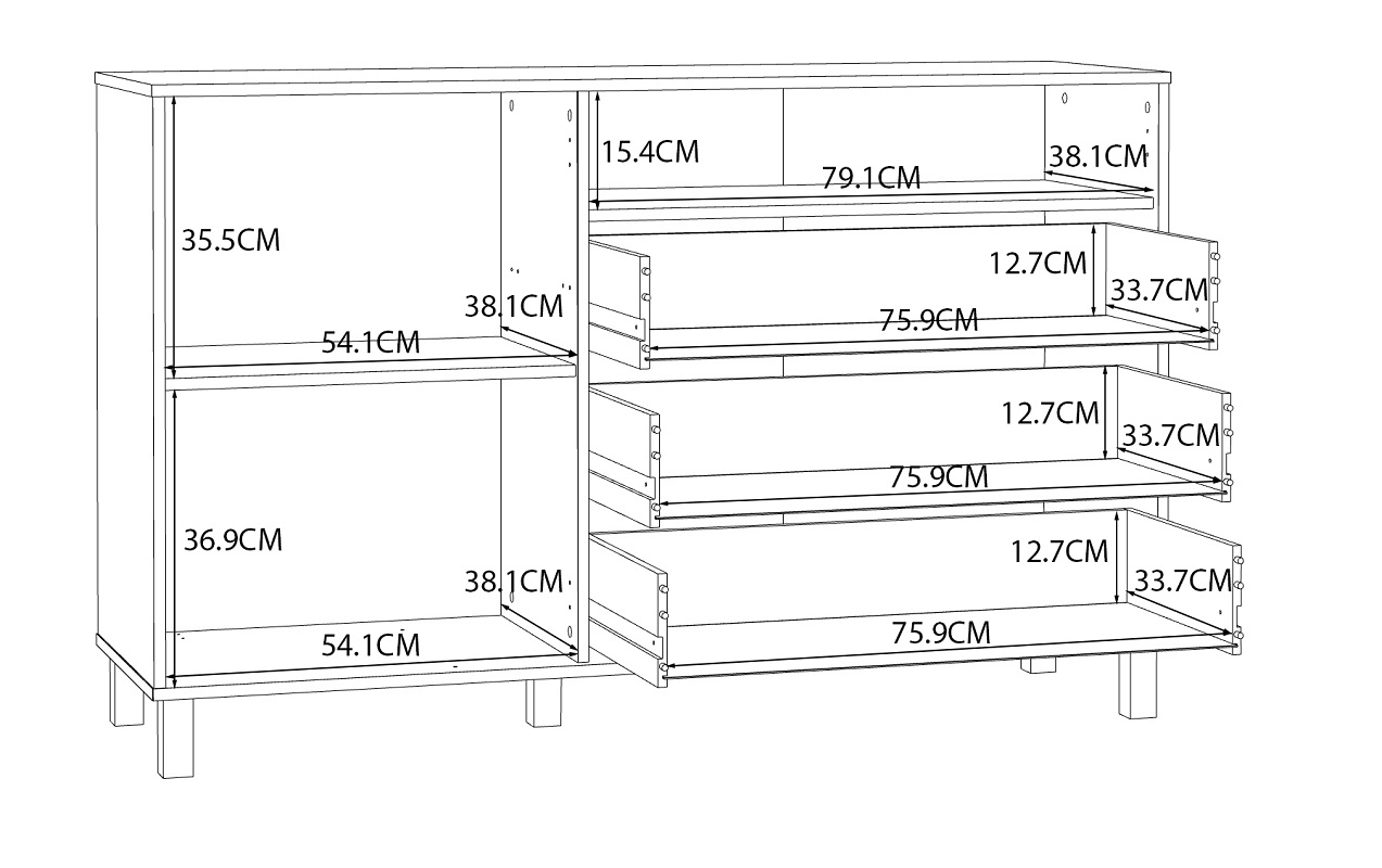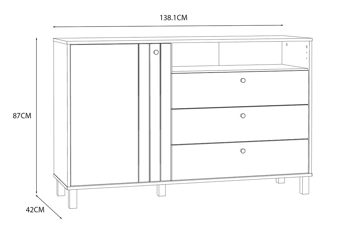 Jednodrzwiowa konstrukcja komody ukrywa w sobie liczne możliwości przechowywania. Trzy przemyślnie zaprojektowane szuflady oferują miejsce na organizację drobiazgów, bielizny czy innych niezbędnych przedmiotów. Dodatkowo, półka za drzwiami pozwala na eksponowanie dekoracji, książek czy sprzętu multimedialnego.
