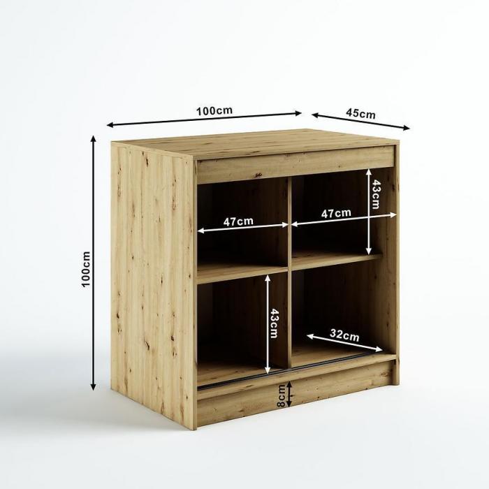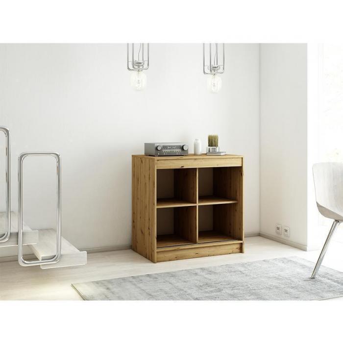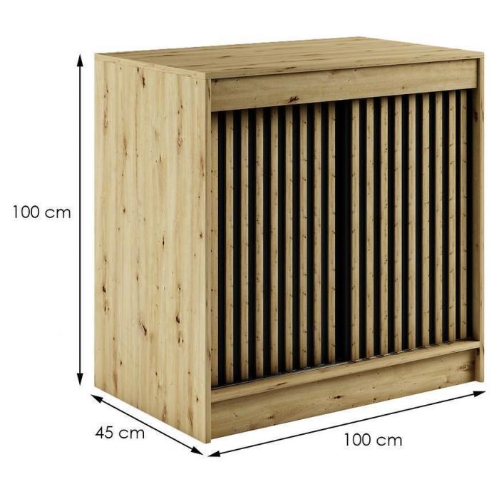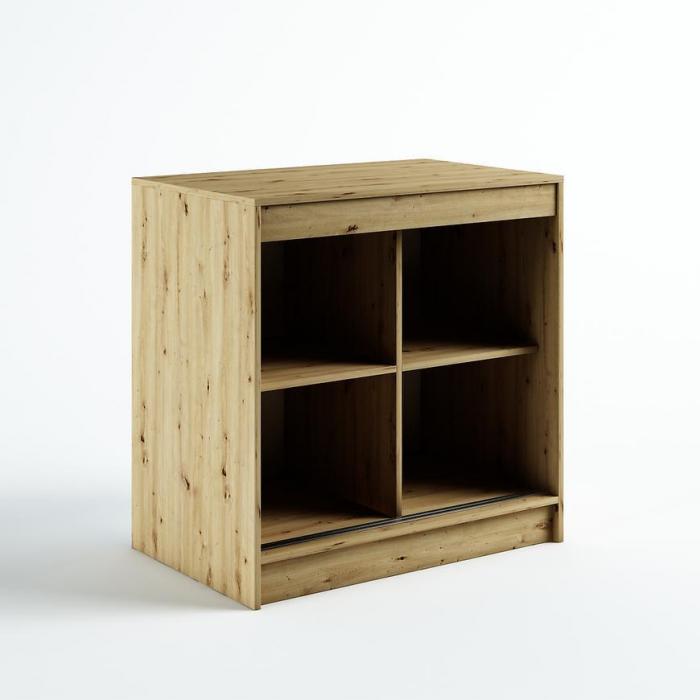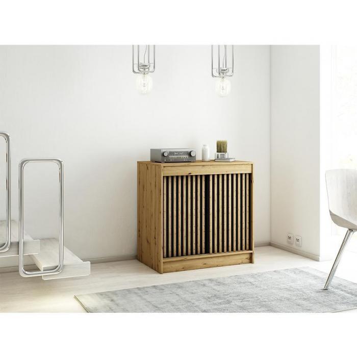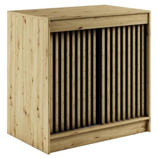 Doskonałym wyborem do pokoju dziennego będzie komoda w kolorze dąb artisan/czarny z kolekcji Lamelo, materiał wykonania to płyta laminowana. Komoda posiada drzwiczki oraz półki dzięki czemu ma łatwy dostęp do wnętrza. Komoda dopełni również wystrój salonu, czy przedpokoju, stanowiąc wygodne miejsce do przechowywania mniejszych i większych rzeczy. Idealnie będzie pasować do stylu loftowego. Mebel do samodzielnego montażu.