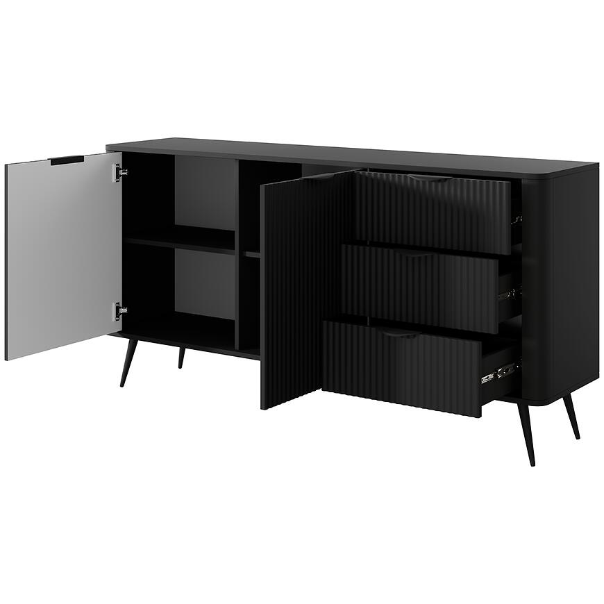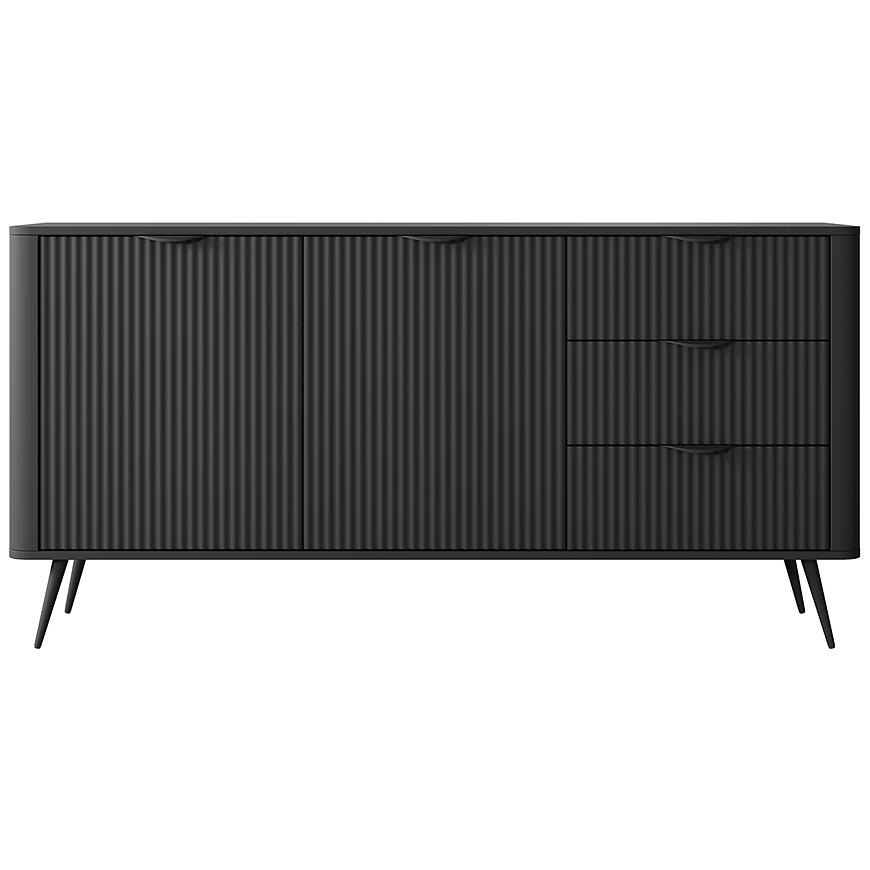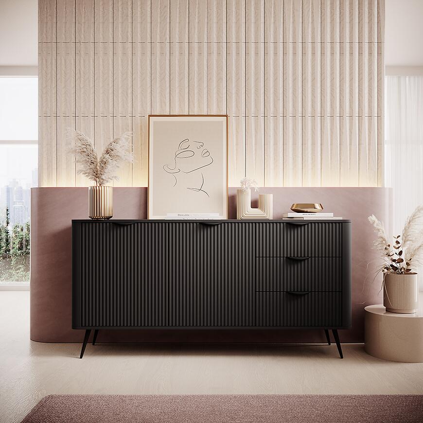 Komoda Lante 163 2D3S w czarnym wybarwieniu to elegancki mebel z kolekcji LANTE, który łączy nowoczesny design z dużą funkcjonalnością. Matowe czarne wykończenie nadaje jej minimalistyczny, wyrazisty charakter, idealny do wnętrz w stylu nowoczesnym, loftowym i industrialnym.