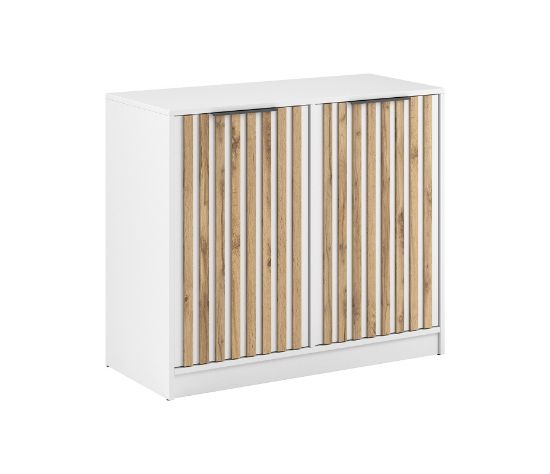 Doskonałym wyborem do pokoju dziennego będzie komoda Laos 2D w kolorze biały mat z elementami koloru dąb wotani. Komoda wykonana z płyty laminowanej, posiada podwójne drzwi, za drzwiami dwie półki po jednej z każdej strony. Komoda dopełni również wystrój salonu, czy przedpokoju, stanowiąc wygodne miejsce do przechowywania mniejszych i większych rzeczy. Mebel do samodzielnego montażu.