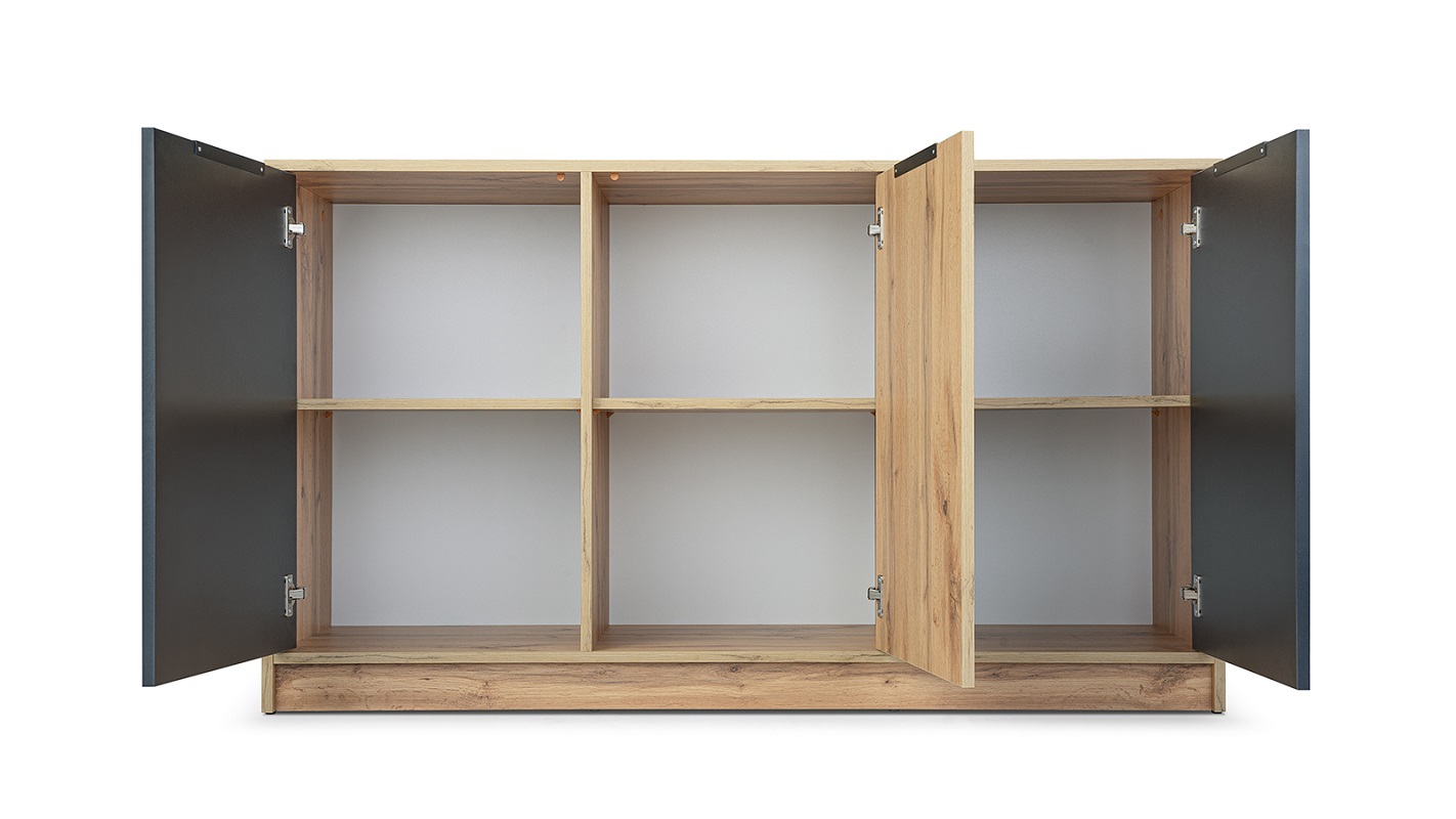 Doskonałym wyborem do pokoju dziennego będzie komoda Laos 3D w kolorze dąb wotan w czarnymi elementami. Komoda wykonana z płyty laminowanej, posiada potrójne drzwi, za drzwiami pakowne półki. Komoda dopełni również wystrój salonu, czy przedpokoju, stanowiąc wygodne miejsce do przechowywania mniejszych i większych rzeczy. Mebel do samodzielnego montażu.
