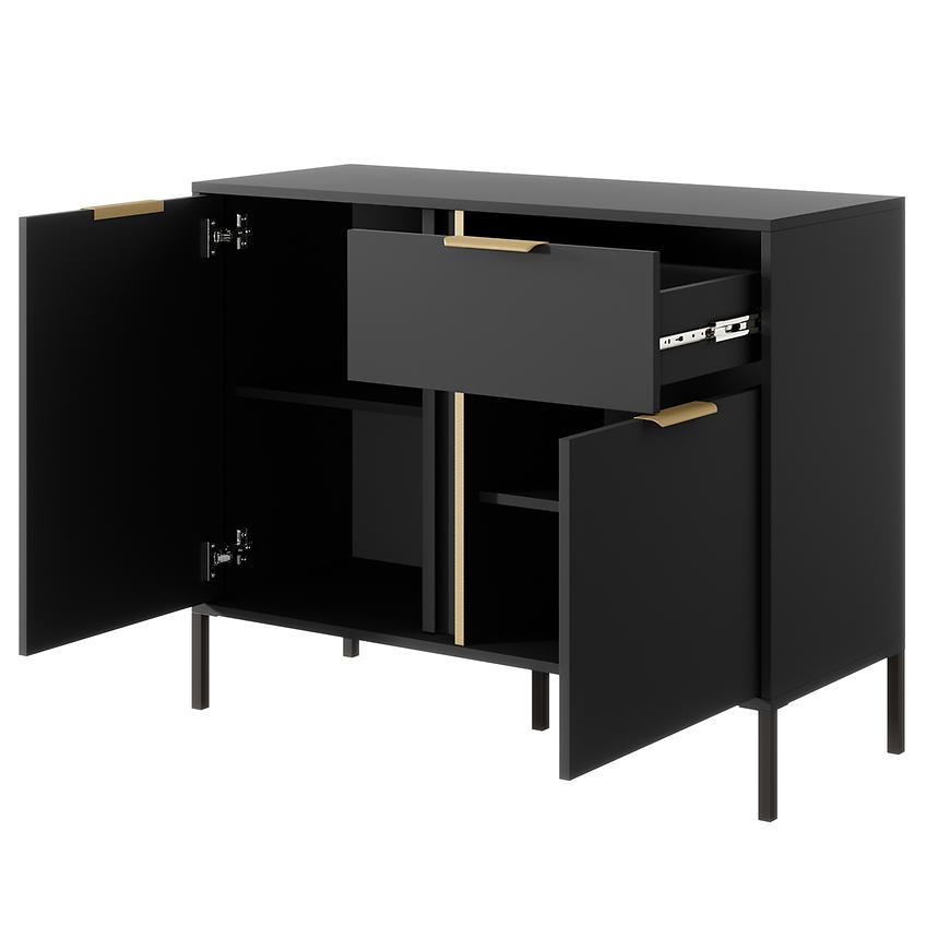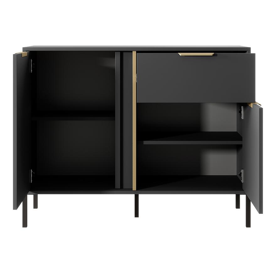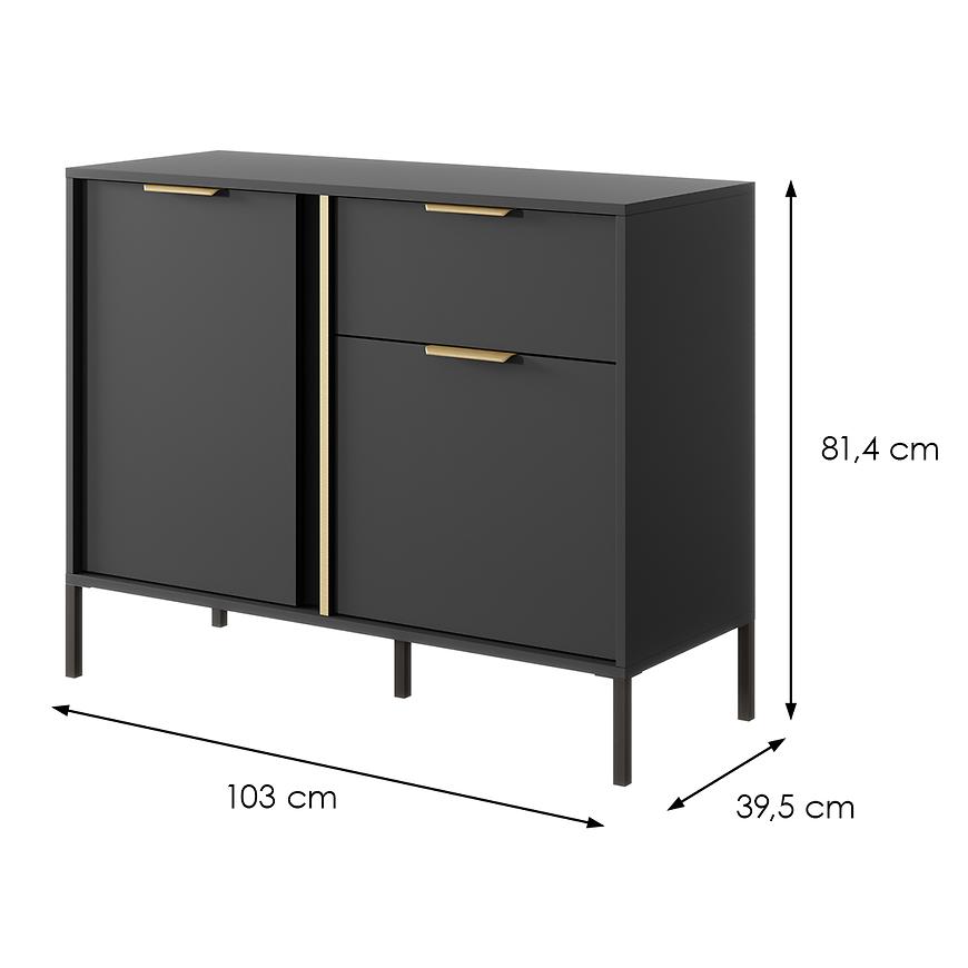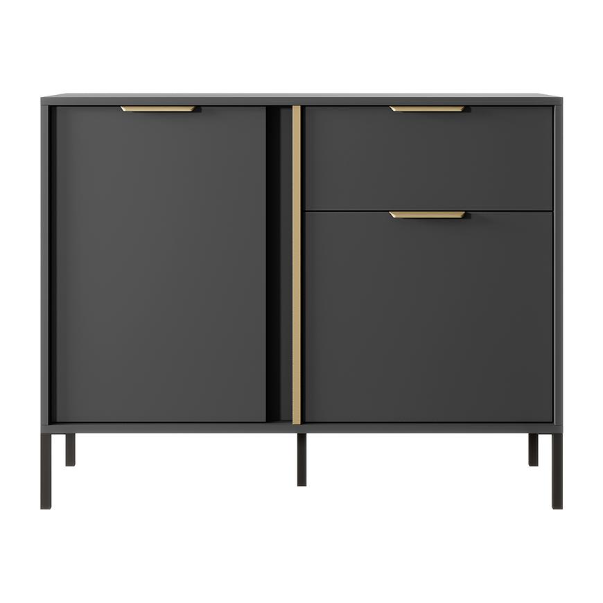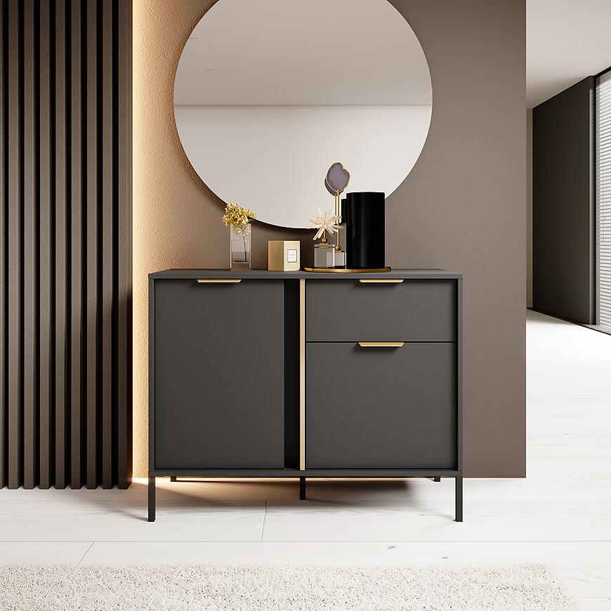 Komoda jest dwudrzwiowa oraz posiada jedną szufladę, za którymi kryje się dodatkowa przestrzeń na przechowywanie.Taka konfiguracja pozwala na uporządkowane przechowywanie różnorodnych przedmiotów, od dokumentów, przez tekstylia, aż po przedmioty codziennego użytku. Nowoczesny design komody LARS, podkreślony antracytowym kolorem i prostymi, ale eleganckimi liniami, sprawia, że mebel ten doskonale wpisuje się w estetykę współczesnych salonów, sypialni czy biur.