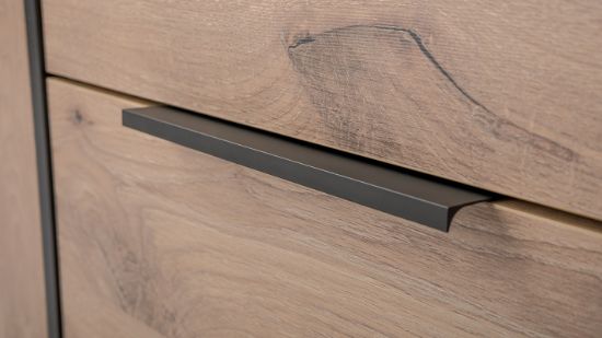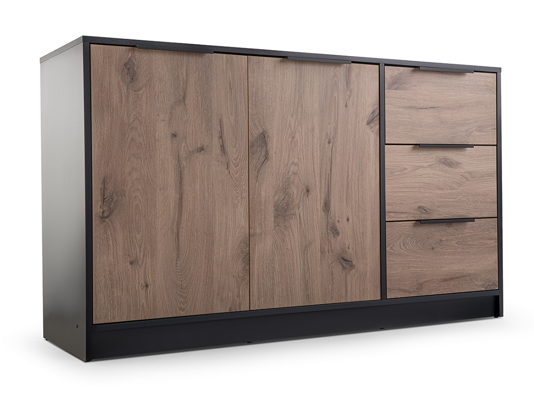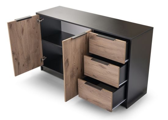Doskonałym wyborem do pokoju dziennego będzie komoda w kolorze czarnym z frontami w kolorze Viking z serii Lati, materiał wykonania to płyta laminowana. Komoda posiada drzwiczki oraz trzy szuflady, dzięki czemu ma łatwy dostęp do wnętrza. Komoda dopełni również wystrój salonu, czy przedpokoju, stanowiąc wygodne miejsce do przechowywania mniejszych i większych rzeczy. Mebel do samodzielnego montażu.