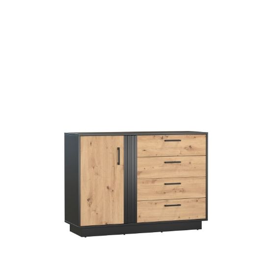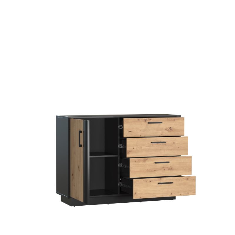Fronty komody, ozdobione dekorem dębu artisan, tworzą efektowne połączenie naturalnego piękna drewna z nowoczesnym designem. To delikatne i przyjemne dla oka połączenie, które nadaje meblowi subtelnego, ale zarazem wyrazistego wyglądu. Lamele z czarnej płyty MDF, umieszczone na frontach, dodają komodzie elementu kontrastu, podkreślając jednocześnie nowoczesny charakter mebla.