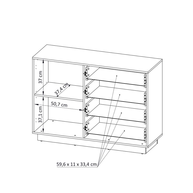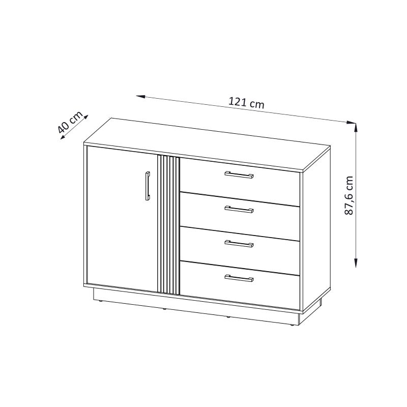 Komoda Lavos 1 jest nie tylko estetyczna, ale także funkcjonalna. Jako jednodrzwiowa komoda, z czterema szufladami i półką za drzwiami, zapewnia dużą ilość miejsca do przechowywania różnorodnych przedmiotów. Szuflady, solidnie osadzone na prowadnicach, umożliwiają łatwe i wygodne korzystanie z mebla. Wnętrze komody zostało przemyślane tak, aby maksymalnie wykorzystać przestrzeń i zapewnić użytkownikowi możliwość skutecznego porządkowania rzeczy.