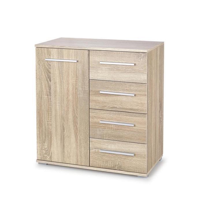 Doskonałym wyborem do pokoju dziennego będzie komoda w kolorze dąb sonoma z serii Lila, materiał wykonania to płyta płyta meblowa laminowana, obrzeża ABS. Komoda posiada drzwiczki oraz szuflady, dzięki czemu ma łatwy dostęp do wnętrza. Komoda dopełni również wystrój salonu, czy przedpokoju, stanowiąc wygodne miejsce do przechowywania mniejszych i większych rzeczy. Mebel do samodzielnego montażu.