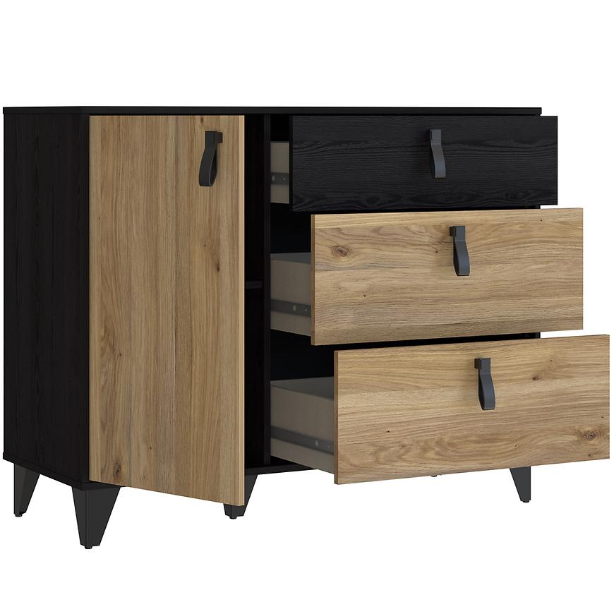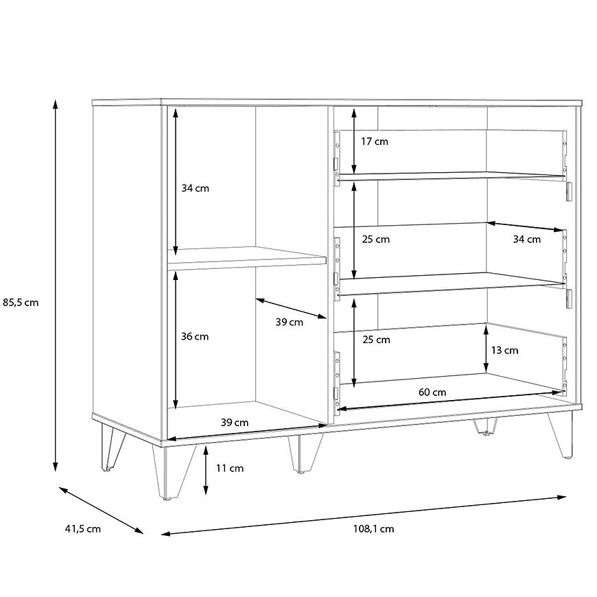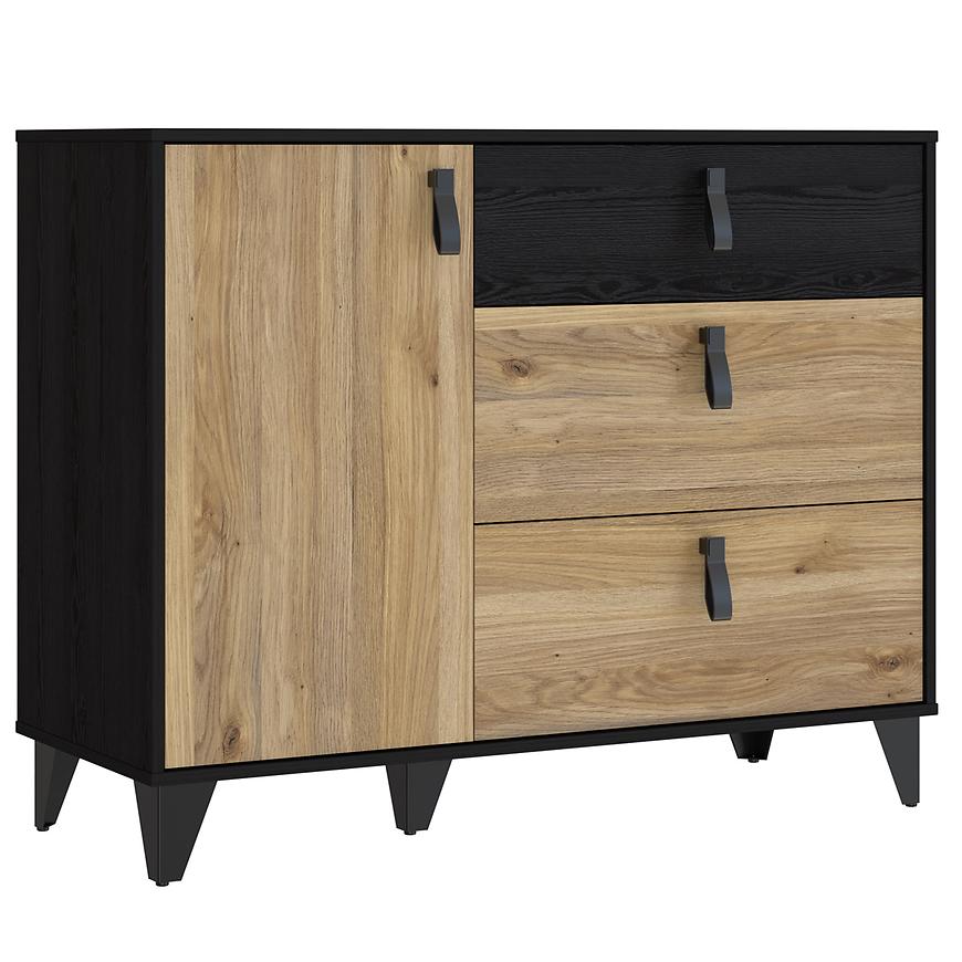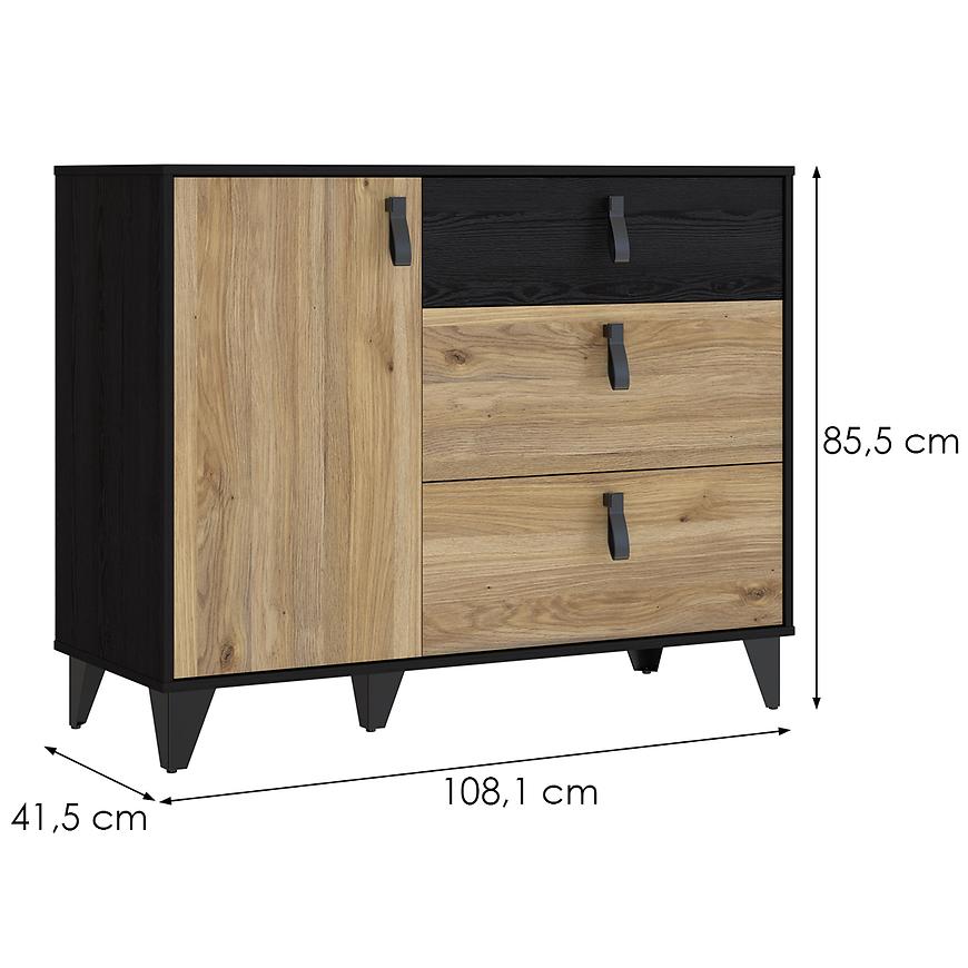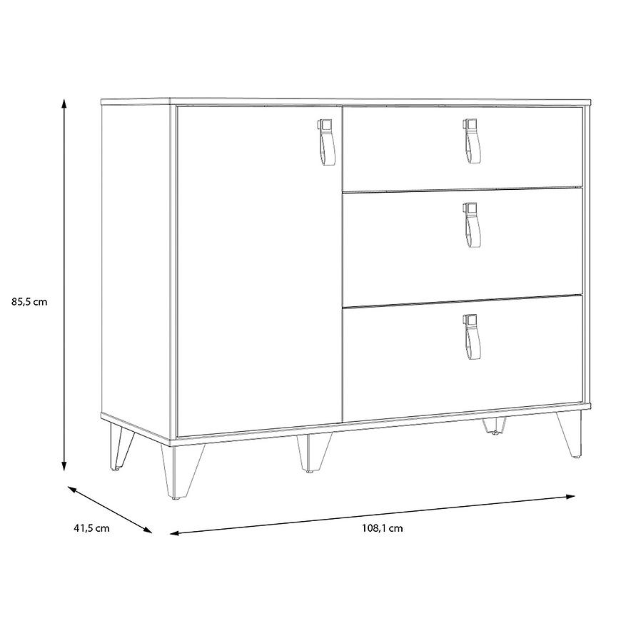 Komoda Liona to stylowy i praktyczny mebel, który doskonale pasuje do nowoczesnych aranżacji wnętrz. Komoda o wymiarach 108,1 cm szerokości, 85,5 cm wysokości i 41,5 cm głębokości, zapewniająca odpowiednio dużo miejsca do przechowywania. Posiada jednodrzwiową szafkę oraz trzy funkcjonalne szuflady, które umożliwiają przechowywanie różnorodnych przedmiotów w porządku.