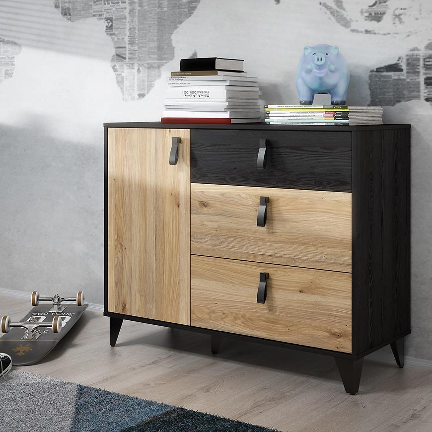 Fronty komody wykończone są matową powierzchnią, nadającą meblowi nowoczesny i elegancki wy gląd. Komoda Liona wykonana jest z wysokiej jakości płyty wiórowej laminowanej, zarówno w konstrukcji frontów, jak i korpusu, co zapewnia trwałość i solidność mebla. Kolor komody to harmonijne połączenie dąbu Mauvella i dębu Cabezone, które dodają meblowi wyjątkowego uroku i naturalnego charakteru.