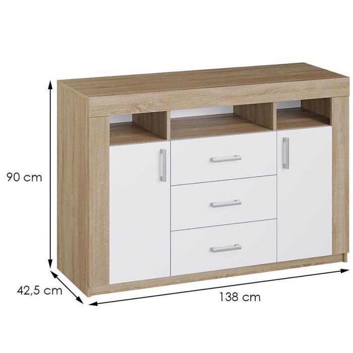 Doskonałym wyborem do pokoju dziennego, czy młodzieżowego będzie komoda w kolor biały/dąb sonoma, materiał wykonania to płyta laminowana. Komoda jest dwudrzwiowa oraz posiada trzy szuflady oraz półki dzięki czemu ma łatwy dostęp do wnętrza. Komoda dopełni również wystrój salonu, czy przedpokoju, stanowiąc wygodne miejsce do przechowywania mniejszych i większych rzeczy. Mebel do samodzielnego montażu.