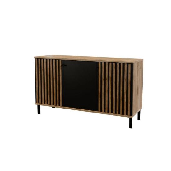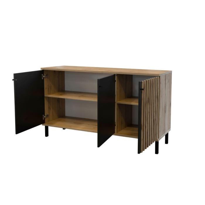 Komoda trzydrzwiowa wykonana z płyty meblowej laminowanej w kolorze dąb wotan. Fronty, po lewej i prawej stronie posiadają ozdobne lamele, środkowe drzwi w kolorze czarnym.