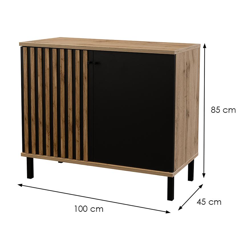 Czarny kolor frontów komody nadaje jej wyjątkowego charakteru, dodając nutę designerskiej ekstrawagancji. Kontrast dąb wotan, używanym jako kolor korpusu, tworzy harmonijne połączenie naturalnego uroku z nowoczesnym stylem. Matowe wykończenie zarówno frontów, jak i korpusu, nie tylko podkreśla elegancję, ale również chroni powierzchnię przed zarysowaniami, utrzymując komodę w doskonałym stanie przez długi czas.