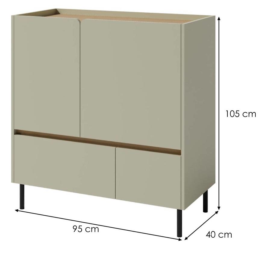 Fronty komody zostały wykonane z wysokiej jakości laminowanej płyty wiórowej o matowym wykończeniu, co nadaje całości eleganckiego i nowoczesnego charakteru. Matowe fronty w ciepłym beżowym odcieniu podkreślają minimalistyczny styl komody, a także są praktyczne, gdyż na takiej powierzchni mniej widoczne są odciski palców czy drobne zarysowania. Korpus w kolorze eukaliptusu i dębu stanowi harmonijne połączenie, które wprowadza do wnętrza naturalne ciepło i przytulność.