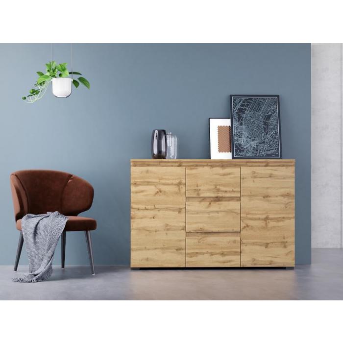 Komoda Luiza w kolorze wotan to przede wszystkim nowoczesność i funkcjonalność w jednym. Kolekcja doskonale sprawdzi się w każdym salonie. Materiał wykonania to płyta laminowana. Komoda posiada trzy szuflady oraz dwie szafki dzięki czemu ma łatwy dostęp do wnętrza. Wygląd mebli jest nowoczesny, a zarazem uniwersalny. Mebel będzie pasował do wielu pomieszczeń jak np. jadalni czy pokoju dziennego. Meble jest bardzo pojemny, dlatego sprawdzi się w każdym pomieszczeniu - zarówno w sypialni, pokoju dziennym, młodzieżowym, czy też salonie. Mebel do samodzielnego montażu.
