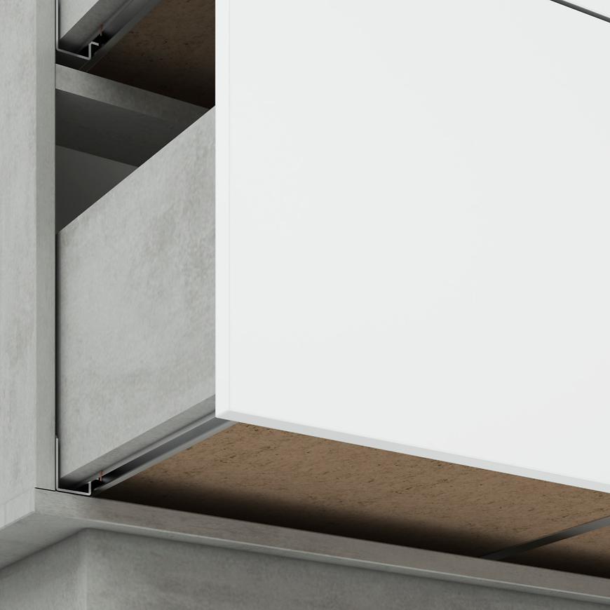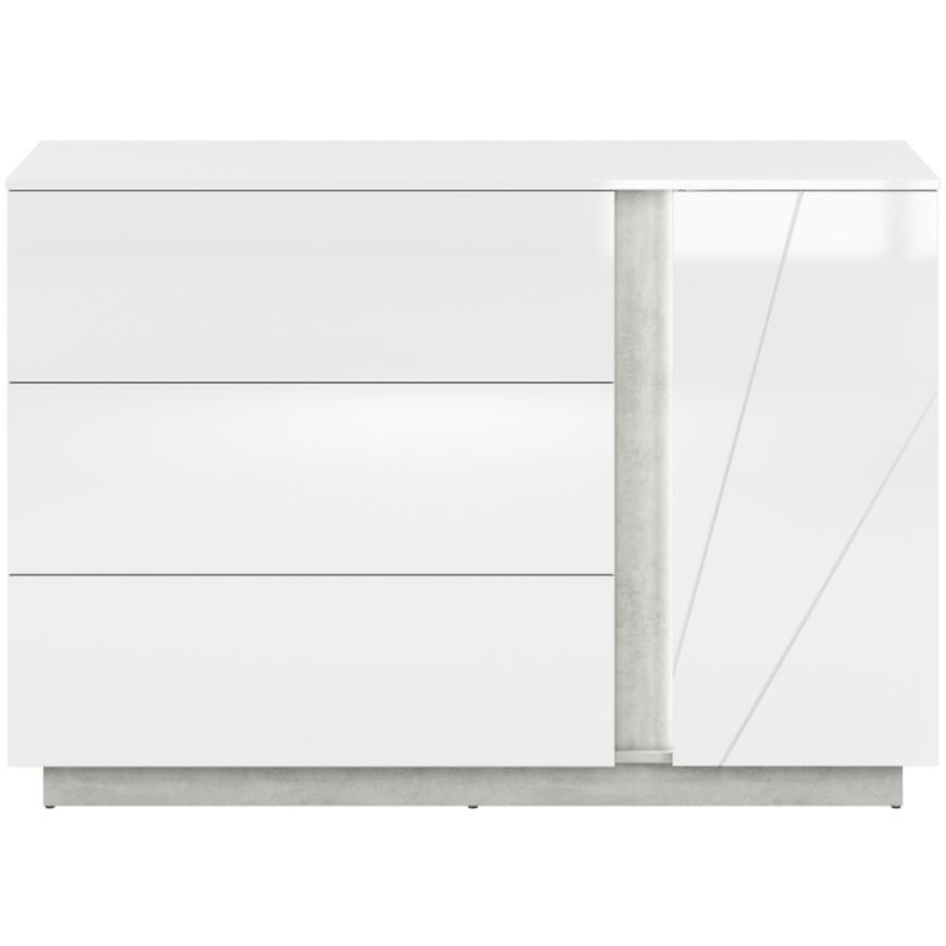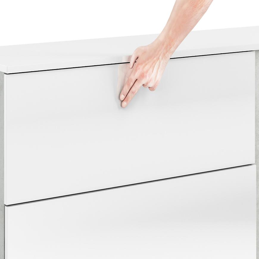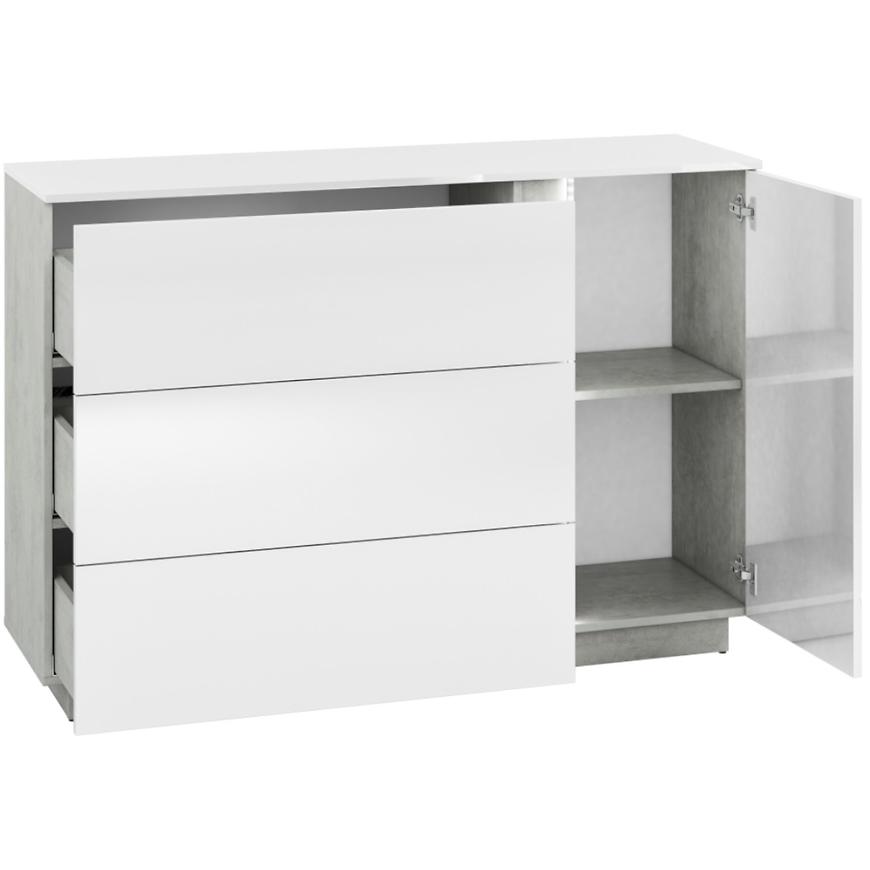 Jednodrzwiowy układ z trzema szufladami zapewnia idealne miejsce na przechowywanie, umożliwiając jednocześnie łatwy dostęp do zgromadzonych przedmiotów. Fronty w kolorze białym nadają meblowi świeżości i lekkości, podczas gdy korpus utrzymany w industrialnym odcieniu betonu dodaje nuty nowoczesnego charakteru.