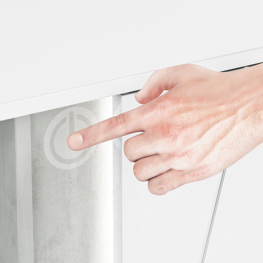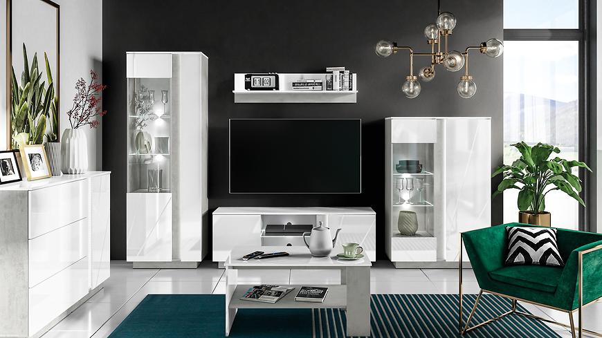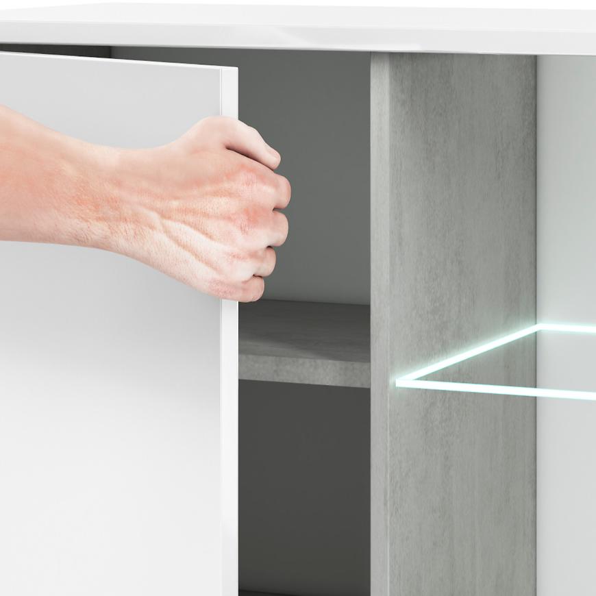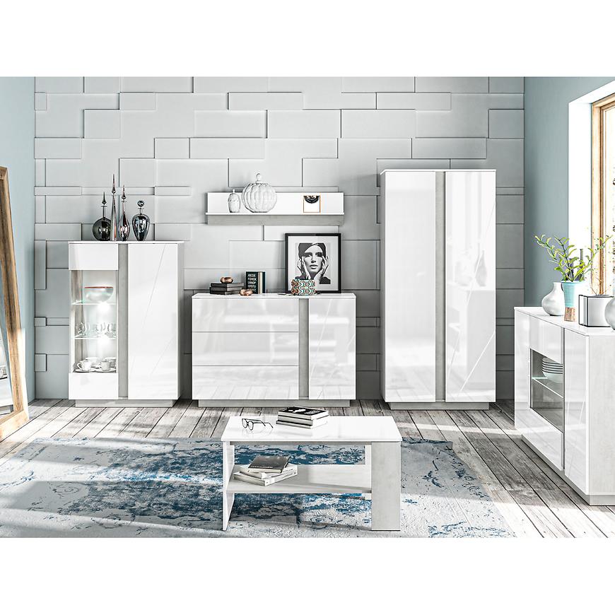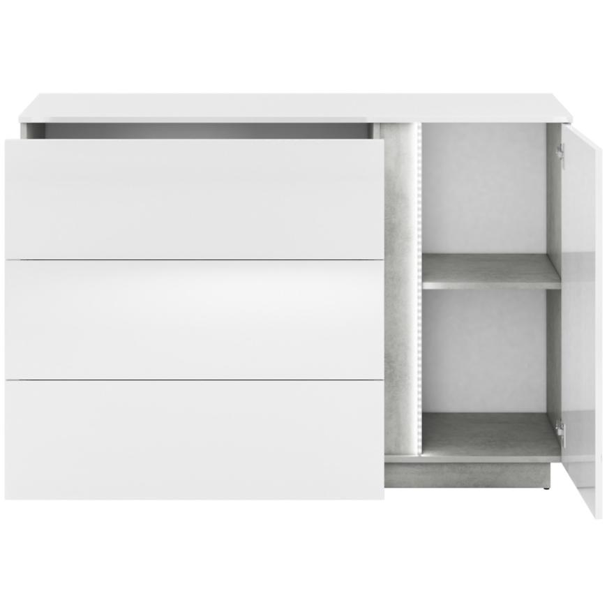 Jednodrzwiowy układ z trzema szufladami zapewnia idealne miejsce na przechowywanie, umożliwiając jednocześnie łatwy dostęp do zgromadzonych przedmiotów. Fronty w kolorze białym nadają meblowi świeżości i lekkości, podczas gdy korpus utrzymany w industrialnym odcieniu betonu dodaje nuty nowoczesnego charakteru.