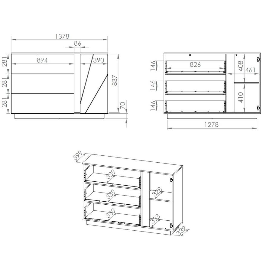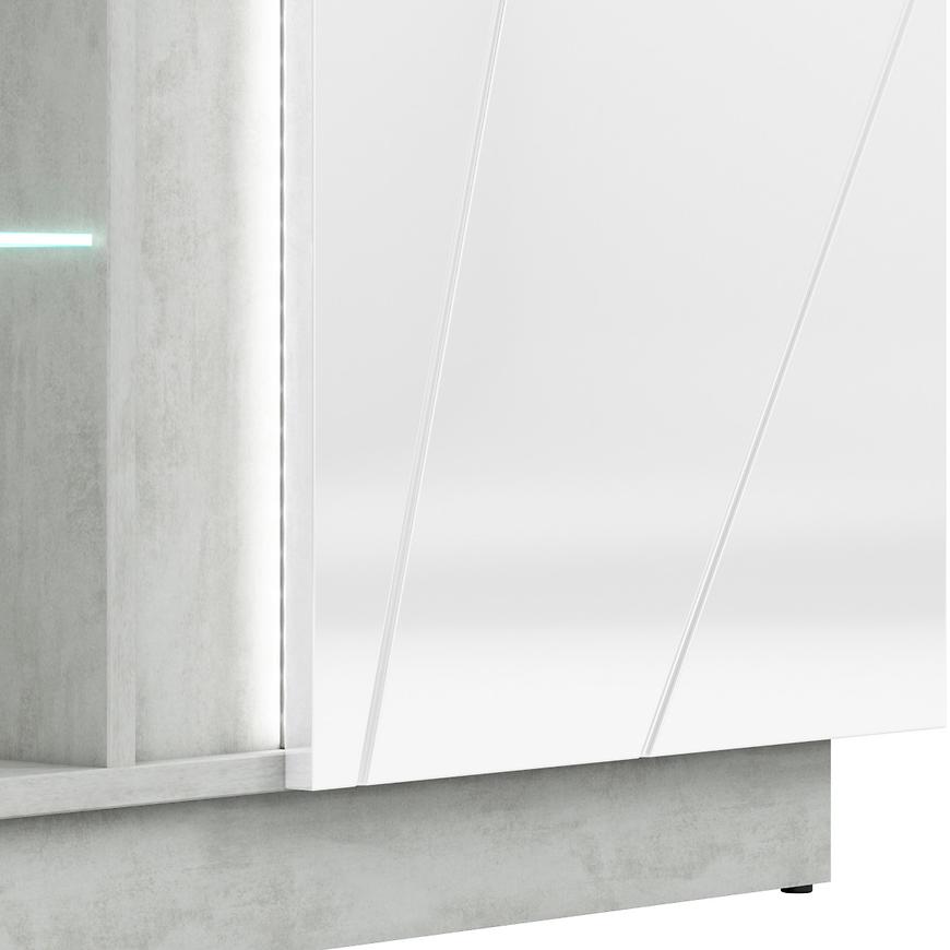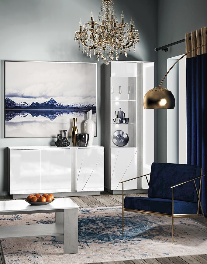 Połyskujące wykończenie frontów nadaje komodzie elegancki i nowoczesny wygląd, podkreślając detale i przyciągając uwagę. Matowe wykończenie korpusu sprawia, że mebel jest łatwy w utrzymaniu i odporny na ścieranie. Opcjonalne oświetlenie LED, dostępne za dopłatą, dodatkowo podkreśla walory komody, tworząc unikalny efekt wizualny.