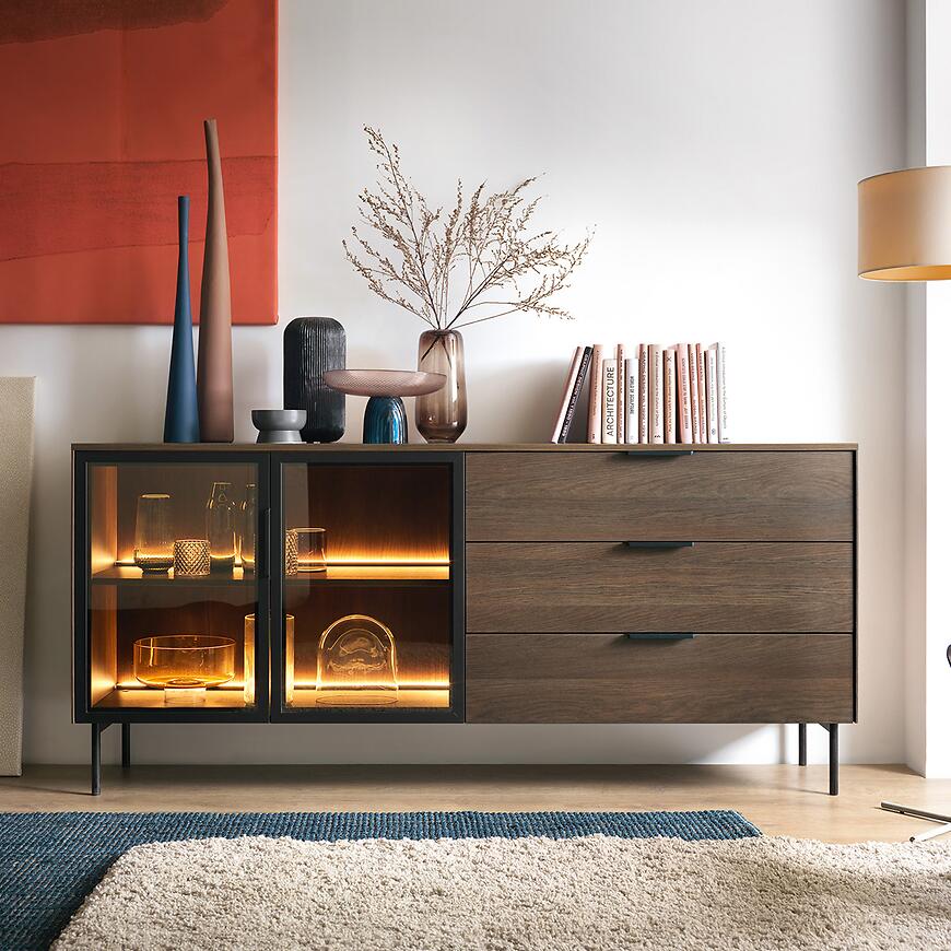 Zintegrowane oświetlenie LED w standardzie pełni funkcję estetycznego akcentu, subtelnie podkreślając strukturę wybarwienia i elegancję czarnych detali. Światło LED dodaje komodzie głębi i nowoczesnego efektu wizualnego, jednocześnie będąc energooszczędnym i trwałym rozwiązaniem.