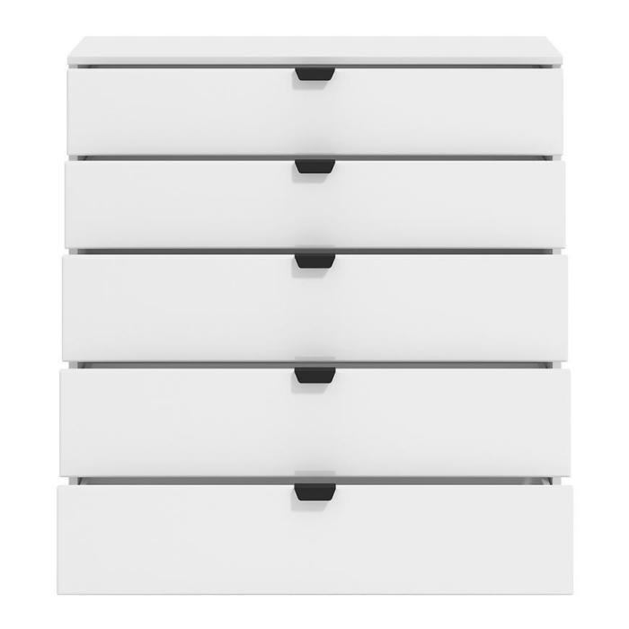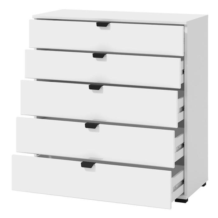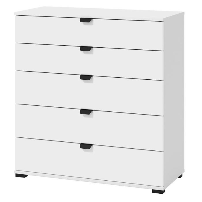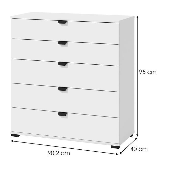 Komoda DUERO to doskonała propozycja do sypialni lub do przedpokoju. Doskonale sprawdzi się również w pokoju dziennym. Posiada pięć szuflad. Wykonana w płyty wiórowej laminowanej. Komoda oferuje funkcjonalne wnętrze, a ponadto wyróżnia się nowoczesnym stylem.