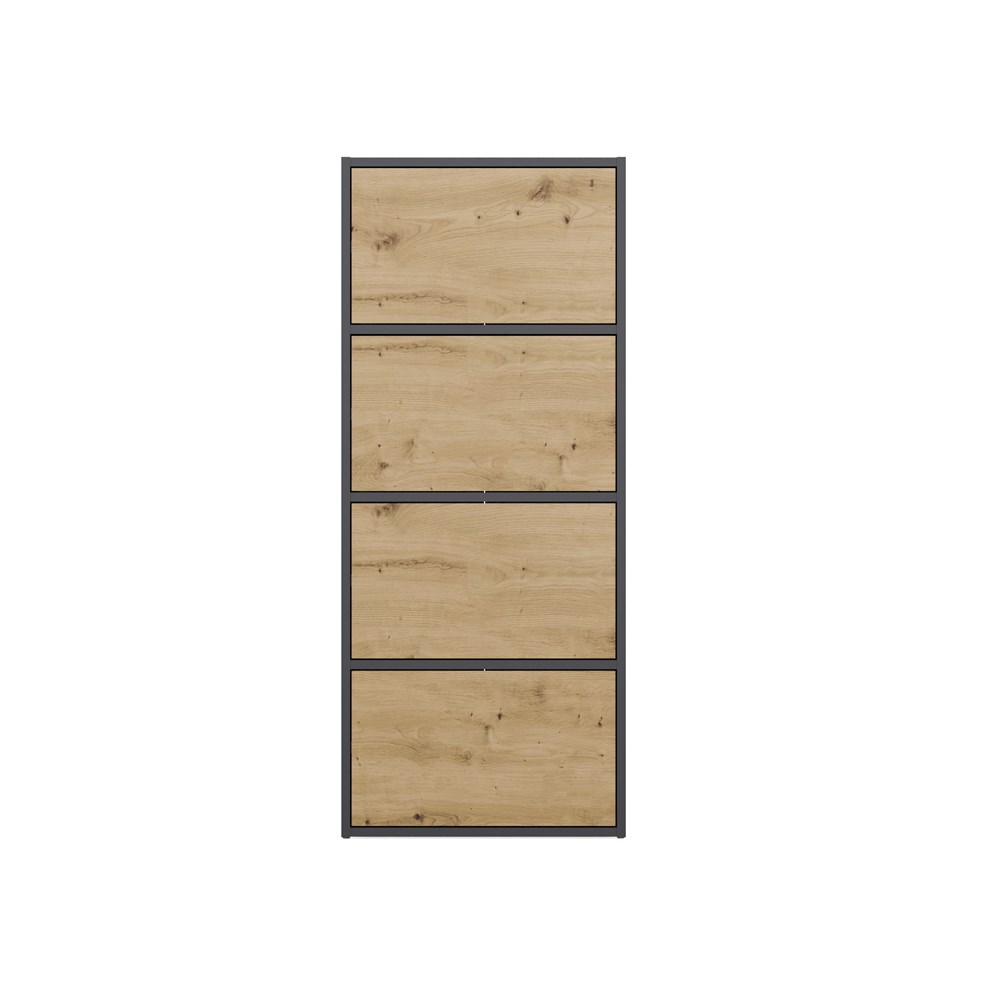 Wyposażona w cztery drzwi z pojemnymi półkami, komoda zapewnia maksymalne wykorzystanie przestrzeni, ułatwiając organizację i przechowywanie niezbędnych przedmiotów. Bezuchwytowe fronty z systemem TIP-ON umożliwiają wygodne otwieranie na dotyk, podkreślając nowoczesny charakter mebla. Konstrukcja wykonana z laminowanej płyty wiórowej o grubości 16 mm gwarantuje trwałość, odporność na zarysowania oraz łatwość w pielęgnacji. Dodatkowo stalowe zawiasy z możliwością precyzyjnej regulacji zapewniają płynne i ciche użytkowanie.