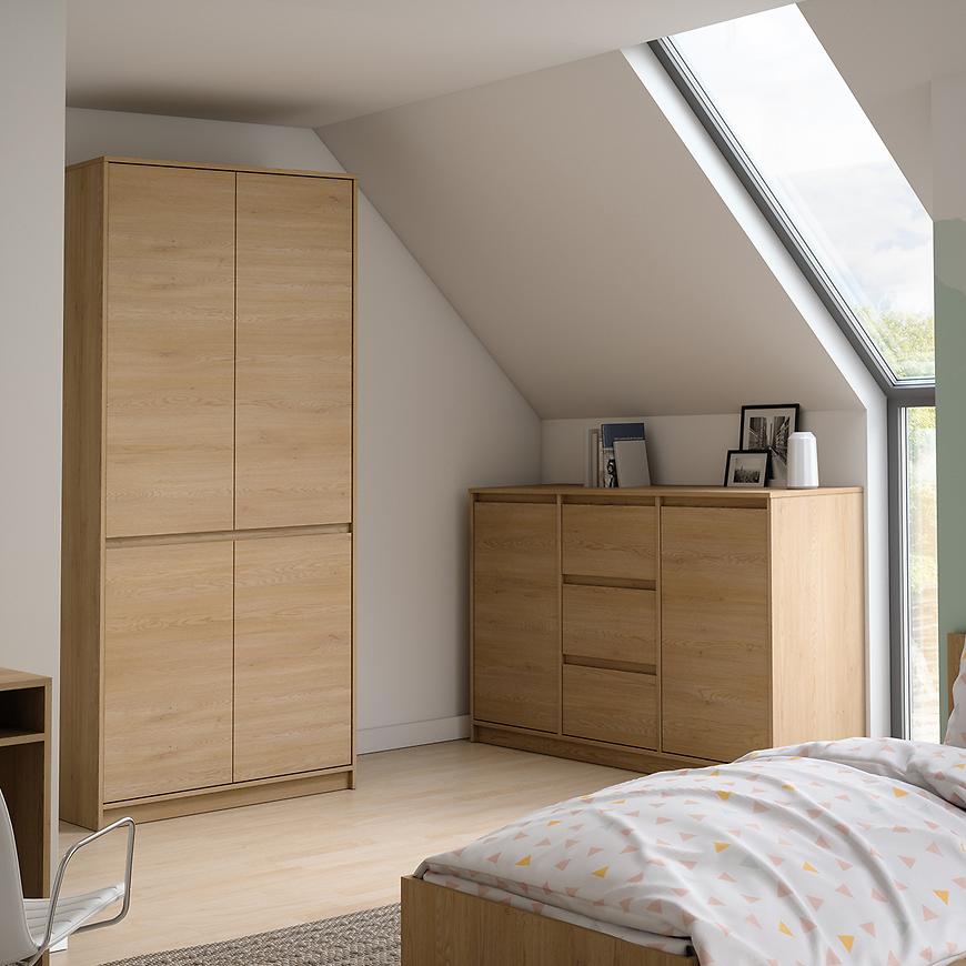 Szafy z kolekcji Manami zostały zaprojektowane z myślą o maksymalnej funkcjonalności i wygodzie przechowywania. Przemyślane wnętrza, półki, wieszaki i szuflady pozwalają uporządkować garderobę, a estetyczne fronty wprowadzają do sypialni nowoczesny charakter. Solidne wykonanie zapewnia trwałość na lata, a odpowiednia organizacja wnętrza ułatwia codzienne użytkowanie.