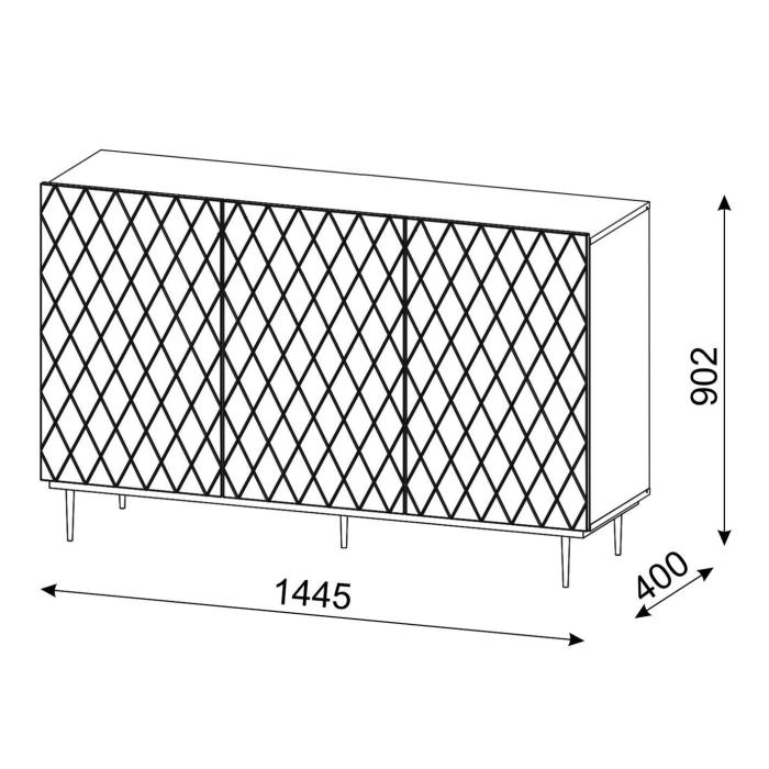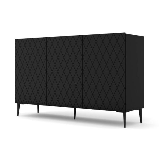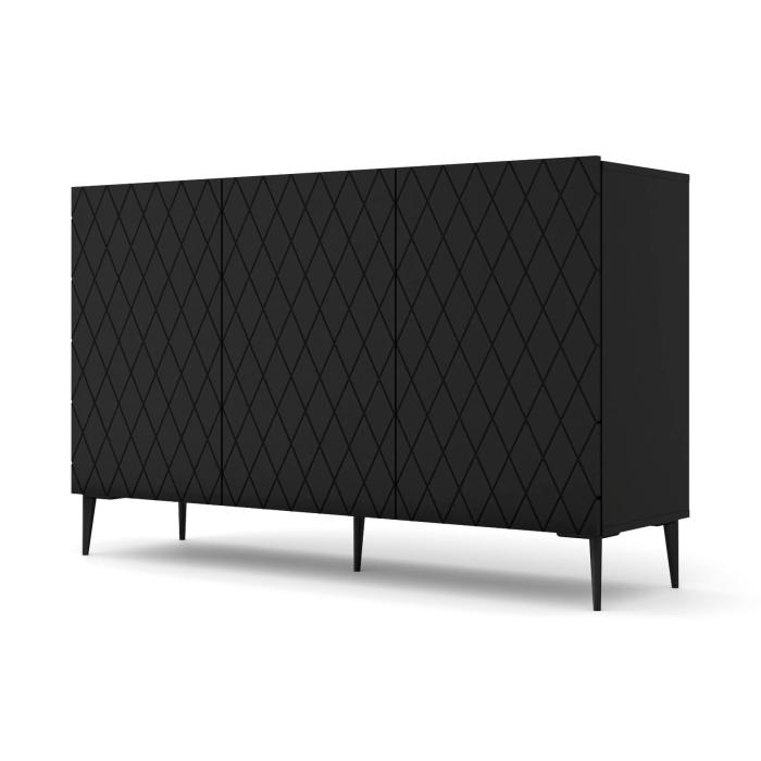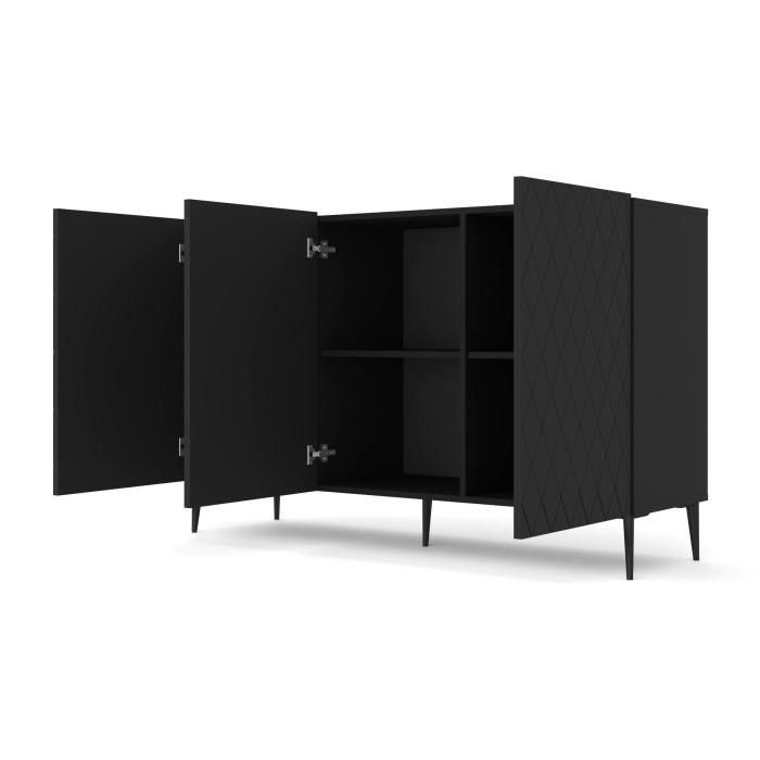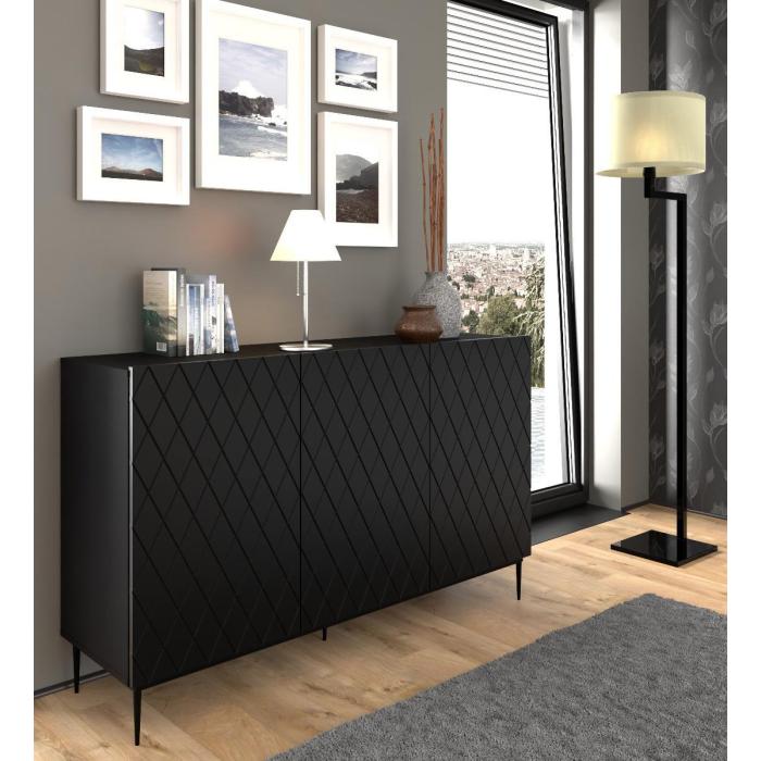 Komoda posiada trzy zamknięte szafki. Całość jest na czarnych eleganckich metalowych nogach w formie szpilki. Meble z serii Marcel są bardzo eleganckie i luksusowe, dlatego sprawdzą się w wielu pomieszczeniach - zarówno w sypialni, pokoju dziennym czy salonie. Mebel do samodzielnego montażu.